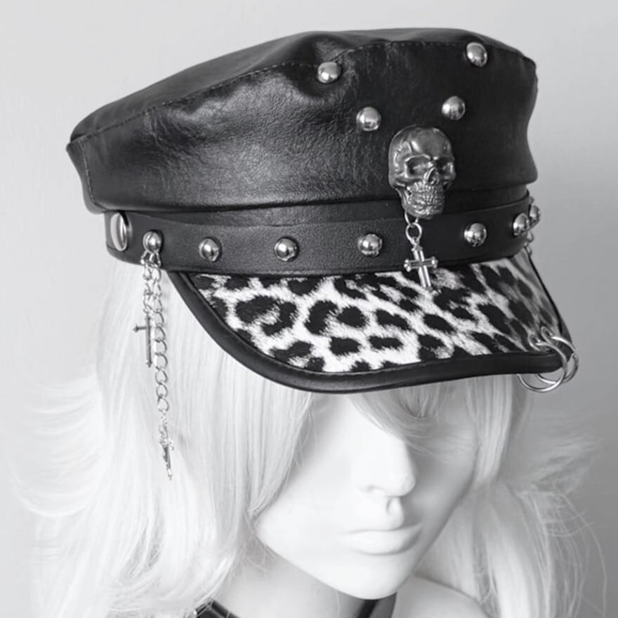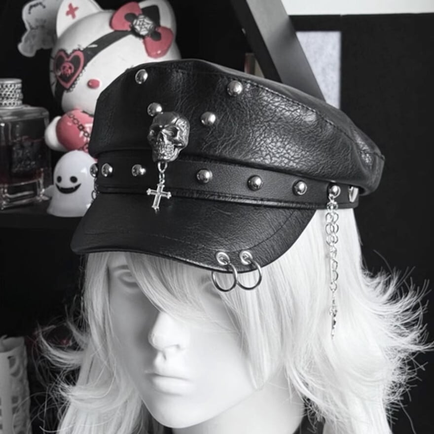 ダークゴシックなスカルがインパクト抜群なスタッズ付きフェイクレザーキャップです