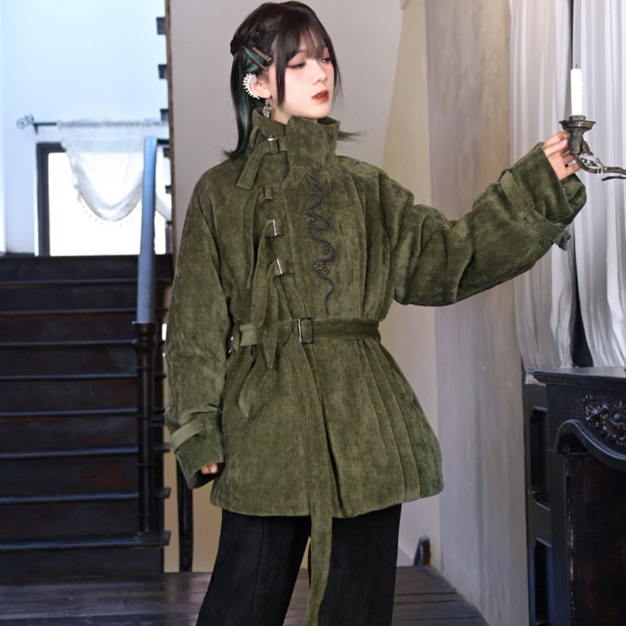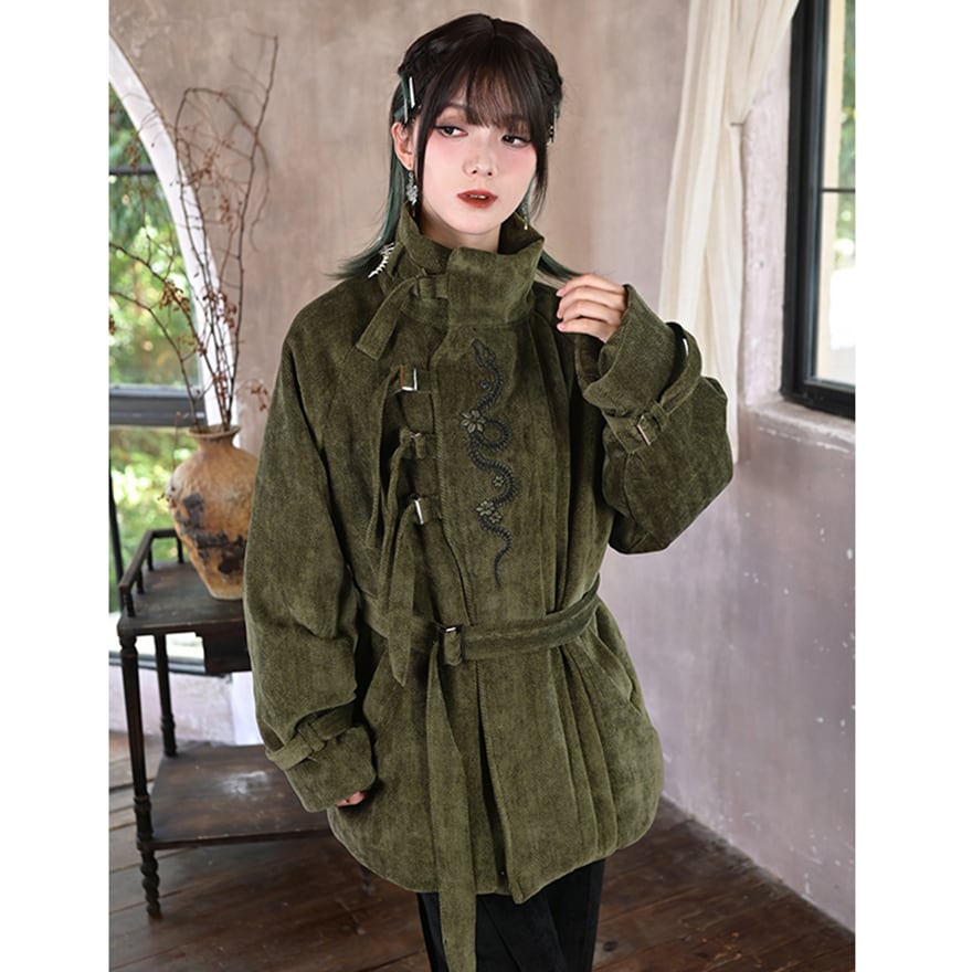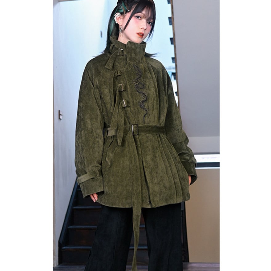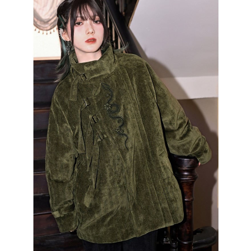 関連キーワード: #サブカル系 #中華風 #チャイナジャケット #コーデュロイ #刺繍 #蛇 #スタンドカラー #ヴィンテージ風 #レトロ #個性的 #古怪舎 #モスグリーン