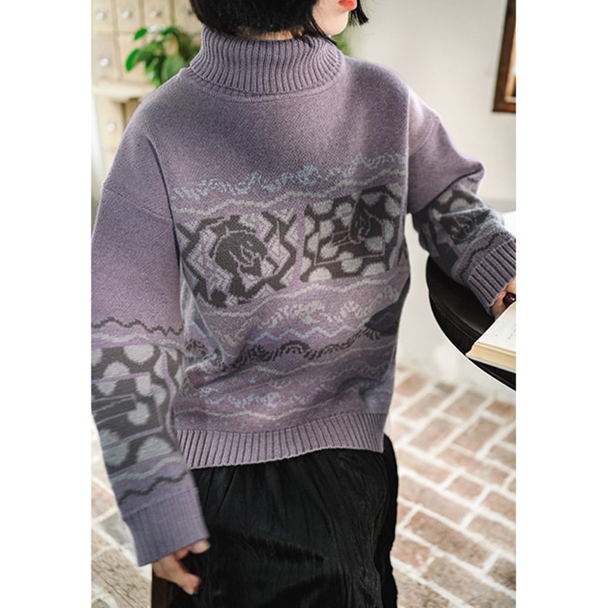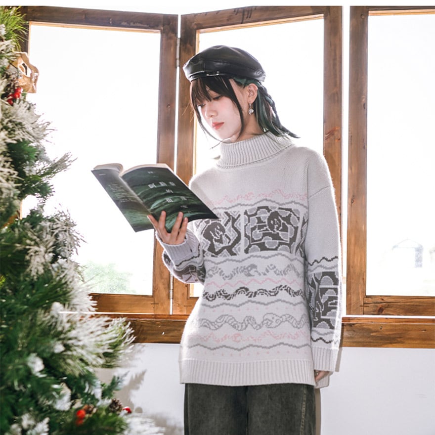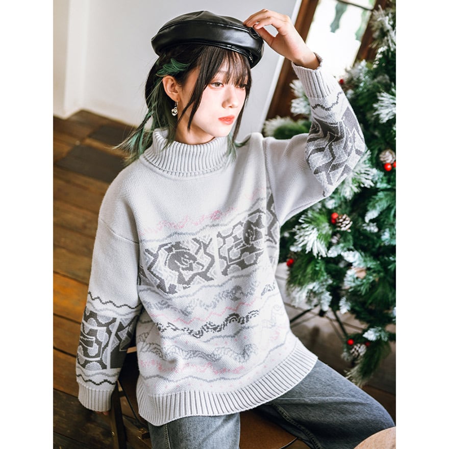 全体に施された薔薇と幾何学模様のジャカード柄が、どこか懐かしいレトロな雰囲気を醸し出すハイネックセーターです。