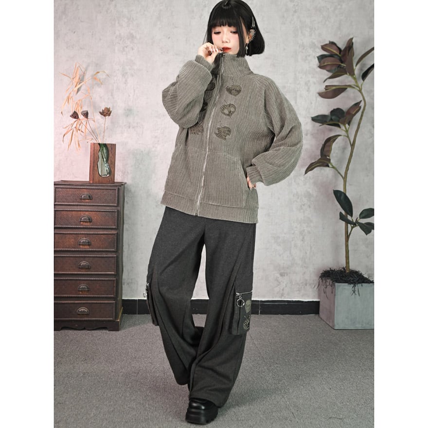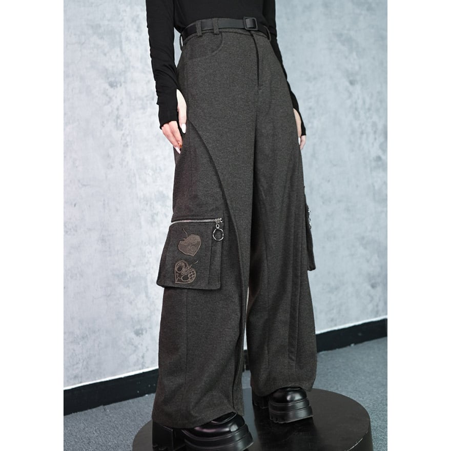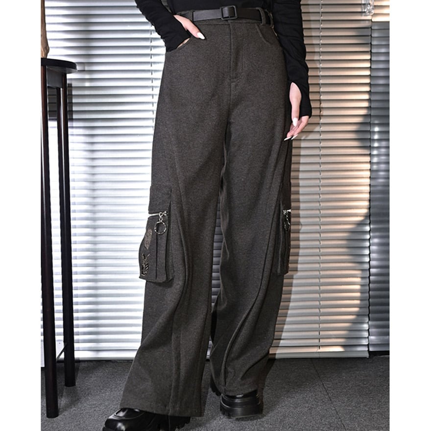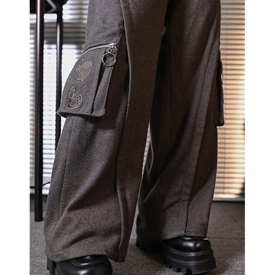 中華ゴシック グレー ウール ワイドレッグパンツ 刺繍 古怪舎