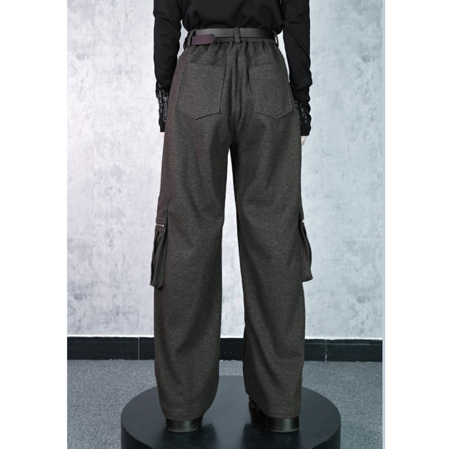 ダークグレーのウール混のような温かみのある生地を使用した、重厚感のあるワイドレッグパンツです。