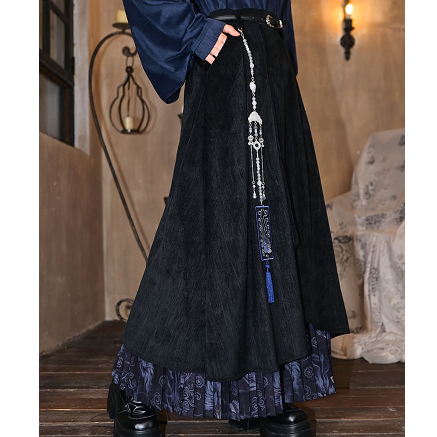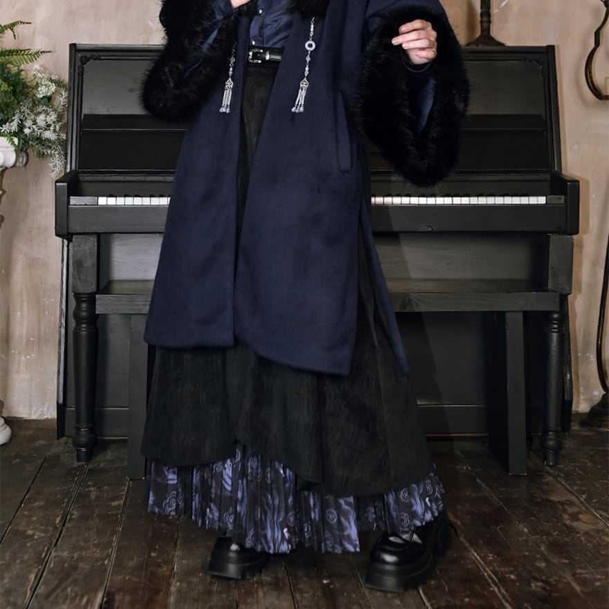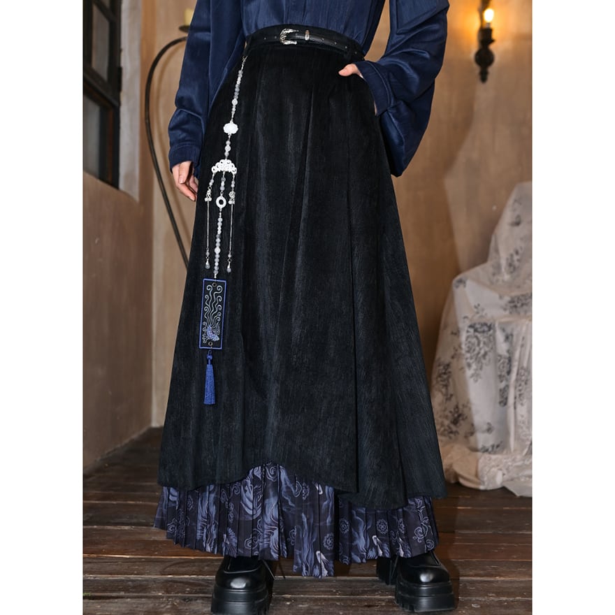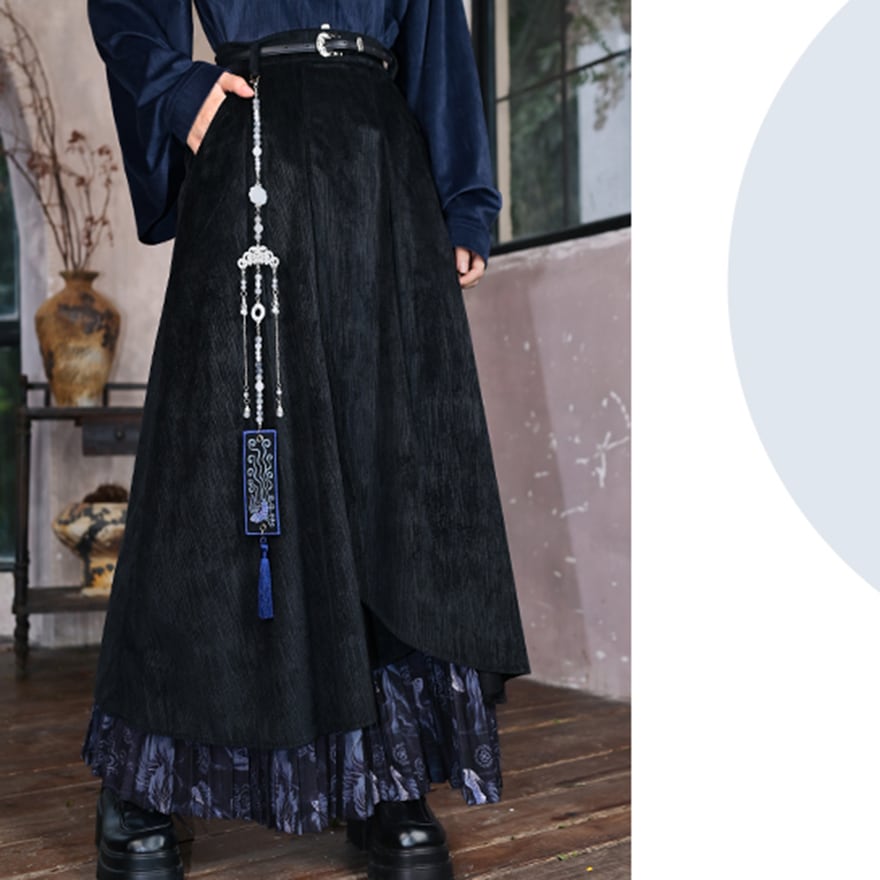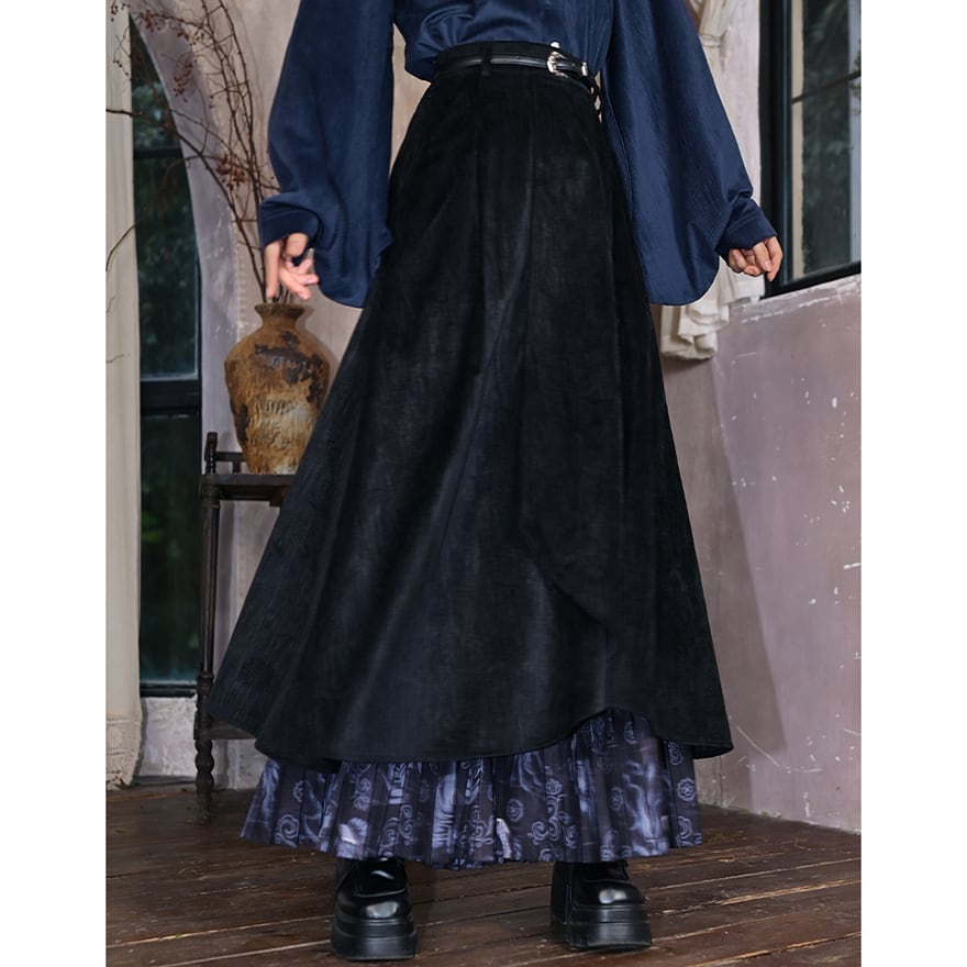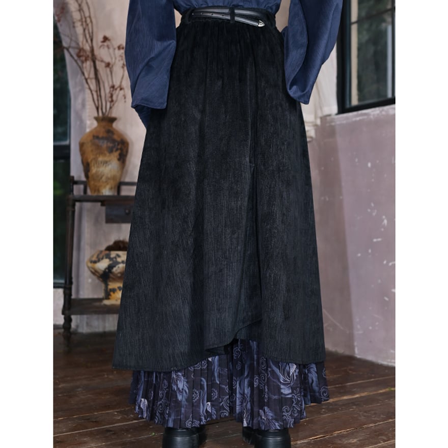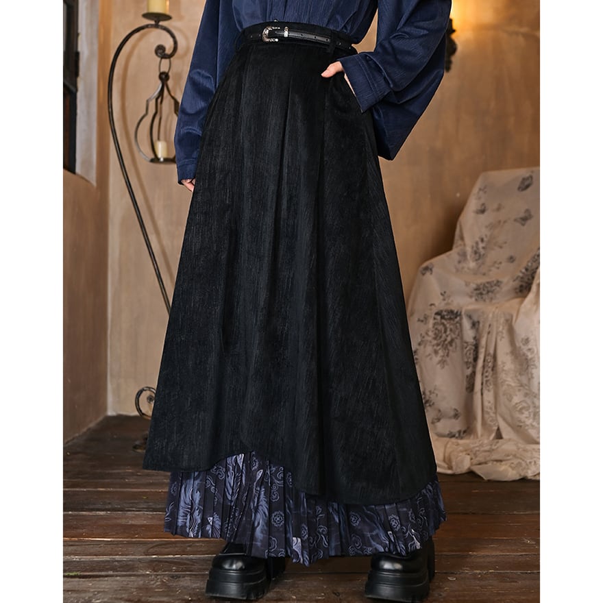 ブラックのコーデュロイ風生地の内側に、龍の鱗を思わせる柄のプリーツスカートを重ねた、アシンメトリーデザインが特徴的なロングスカートです。