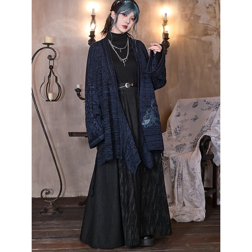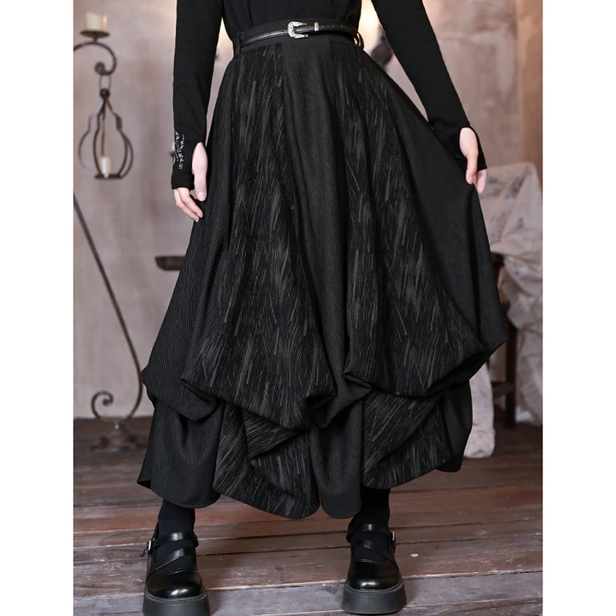 シンプルなトップスを合わせるだけで、スカートの独創的なデザインが際立ち、洗練されたダークなコーディネートが完成します。