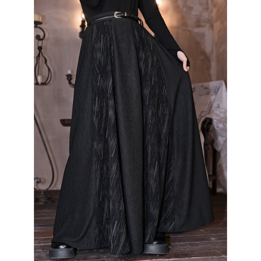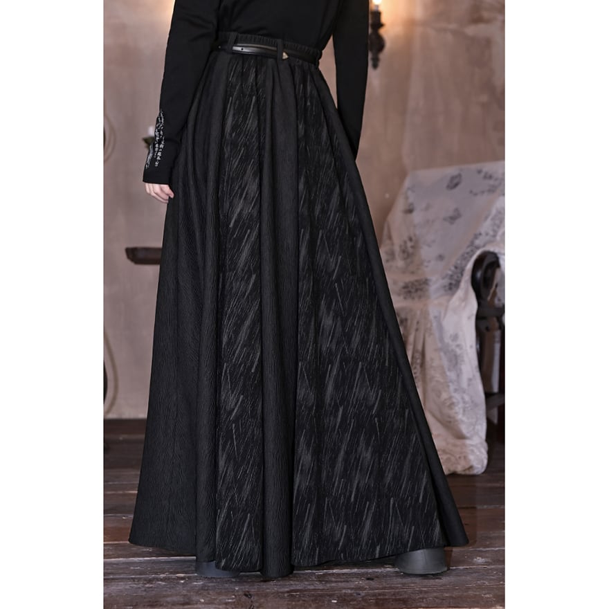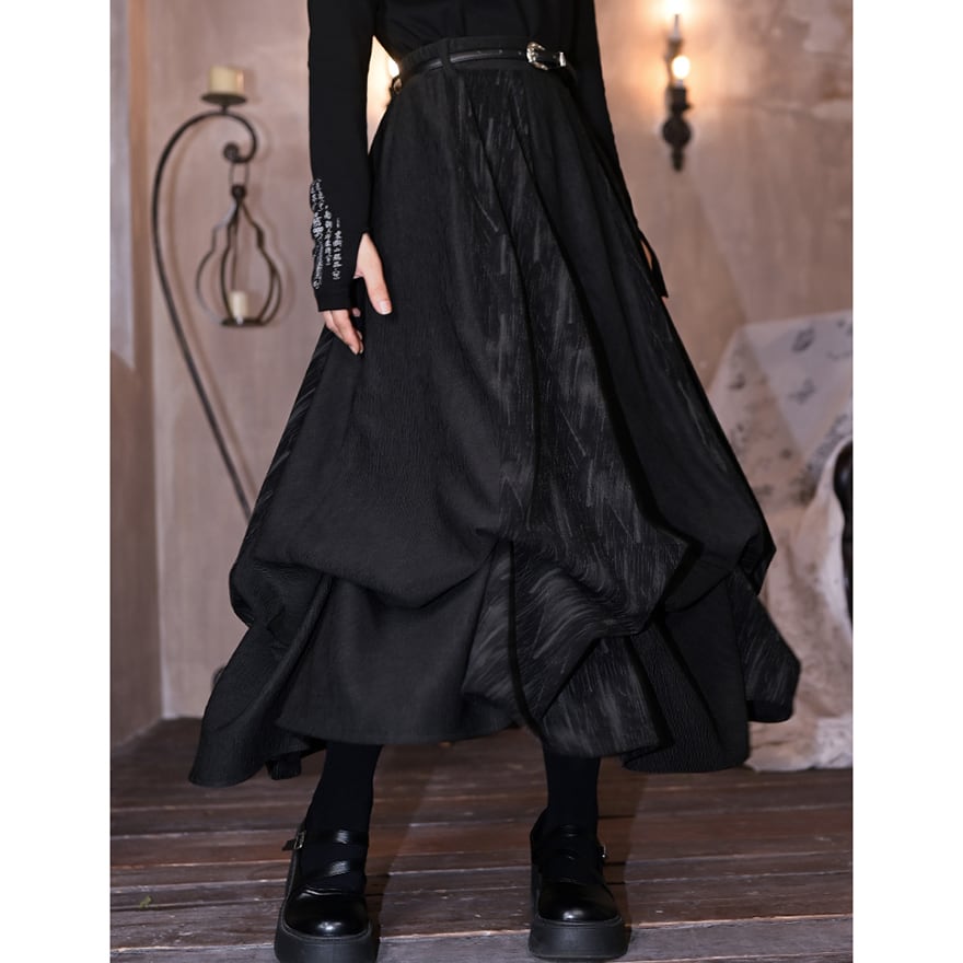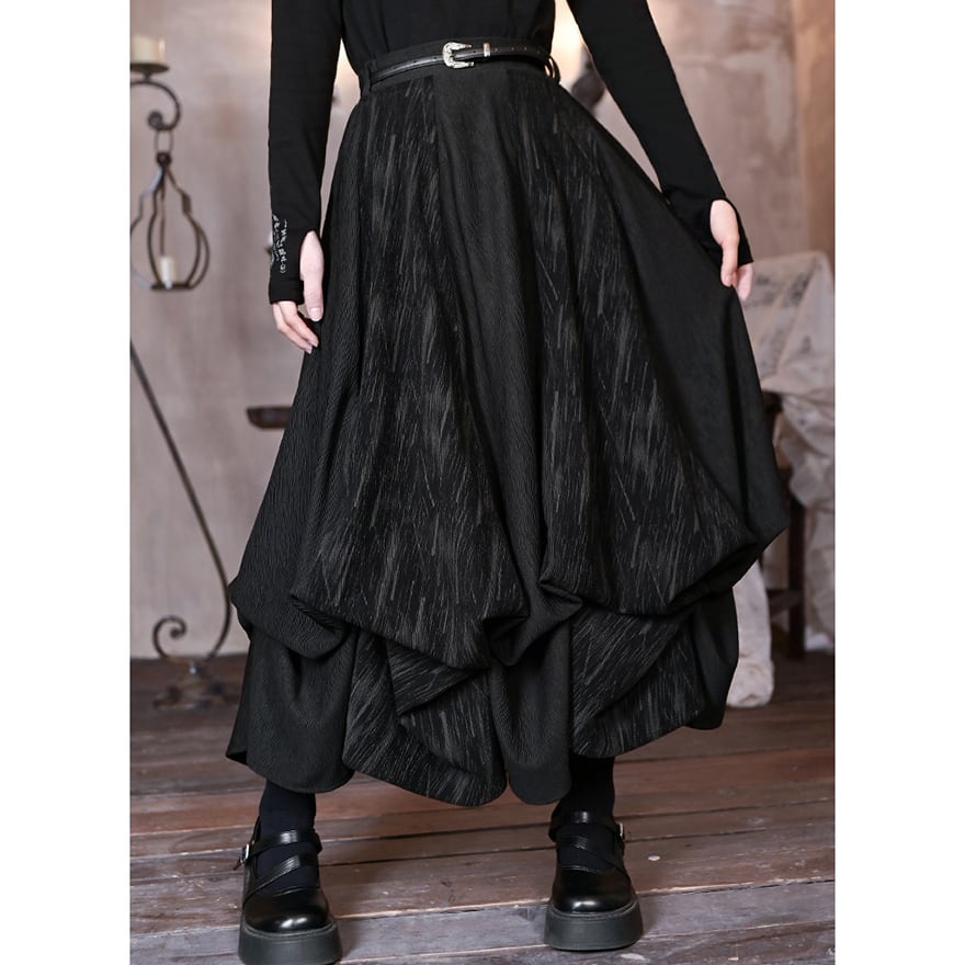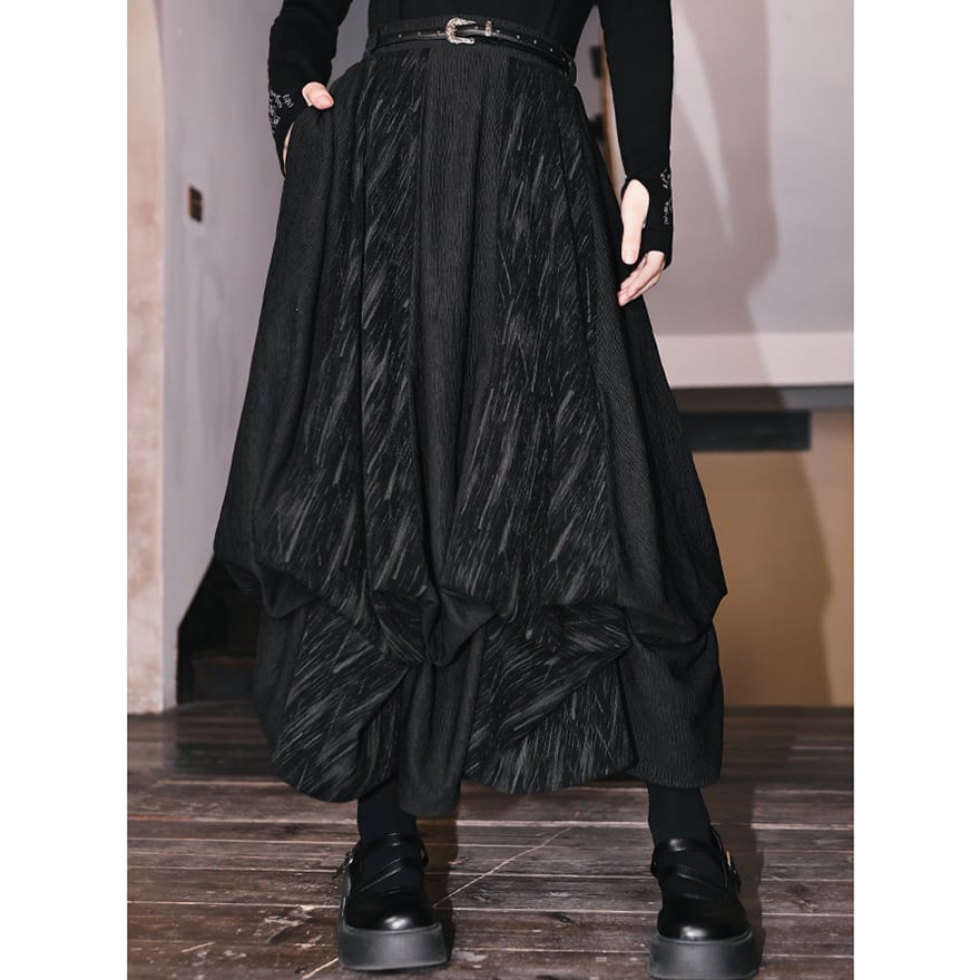 独特のしわ加工と、かすれたような模様が浮かび上がるブラックの生地を使用した、モードな雰囲気のロングスカートです。