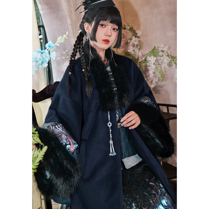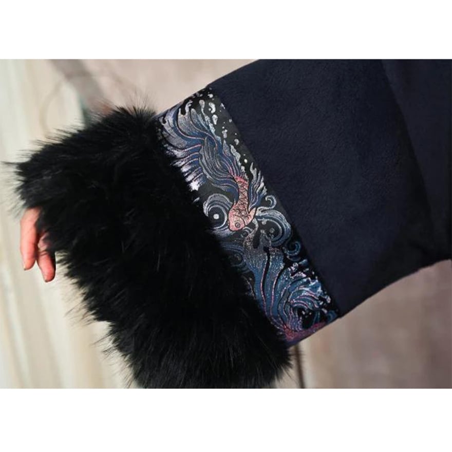 襟元と袖口にはボリュームたっぷりの黒いフェイクファーがあしらわれ、豪華でミステリアスな雰囲気を演出します。