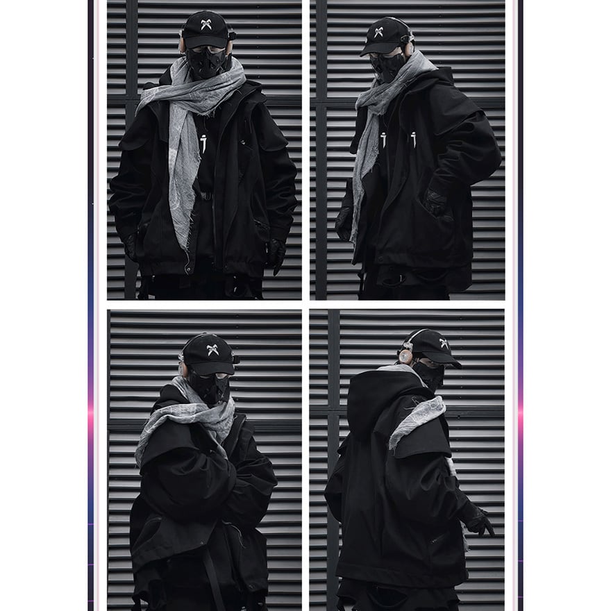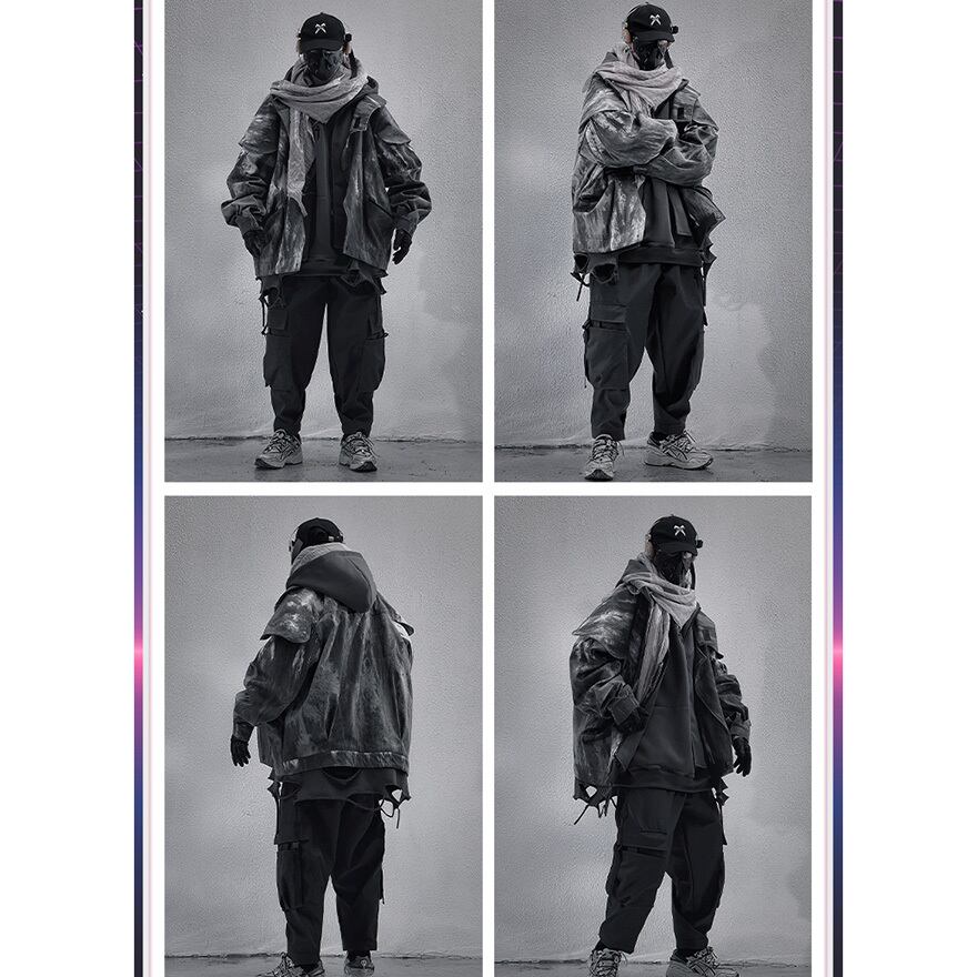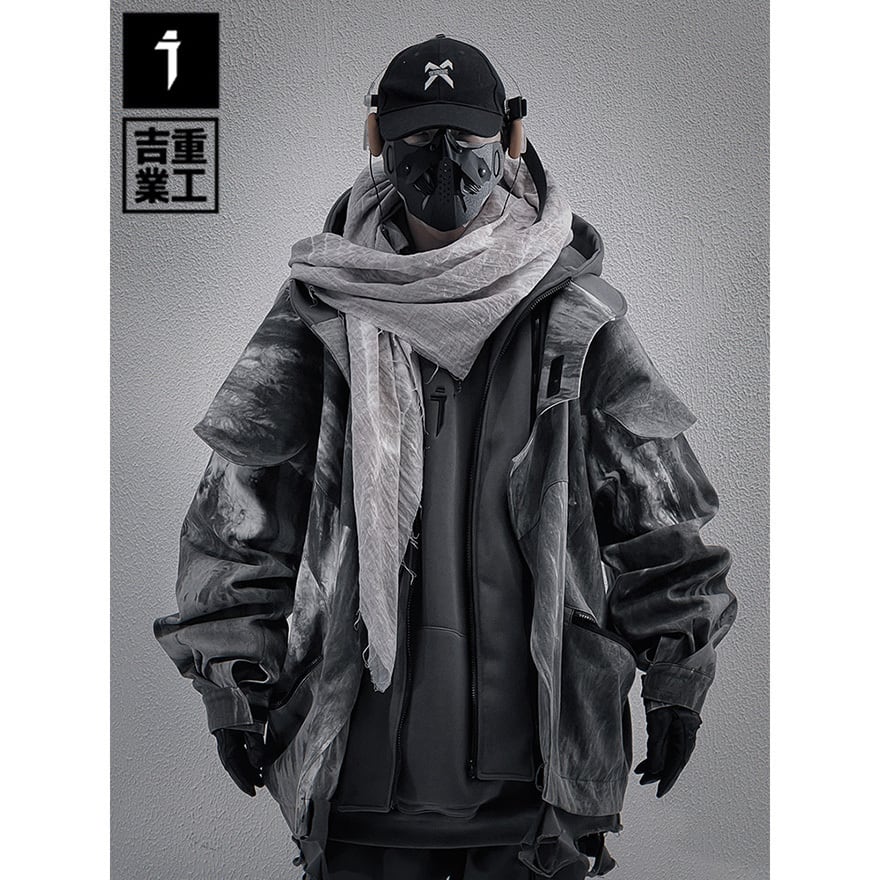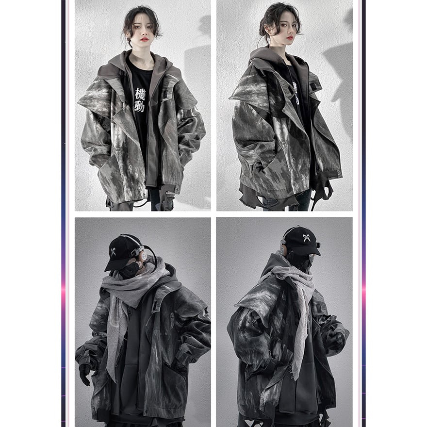 関連キーワード: #サイバーパンク #テックウェア #ジャケット #フェイクツーピース #レイヤード #ストリートファッション #モード系 #ユニセックス #アウター #ダメージ加工