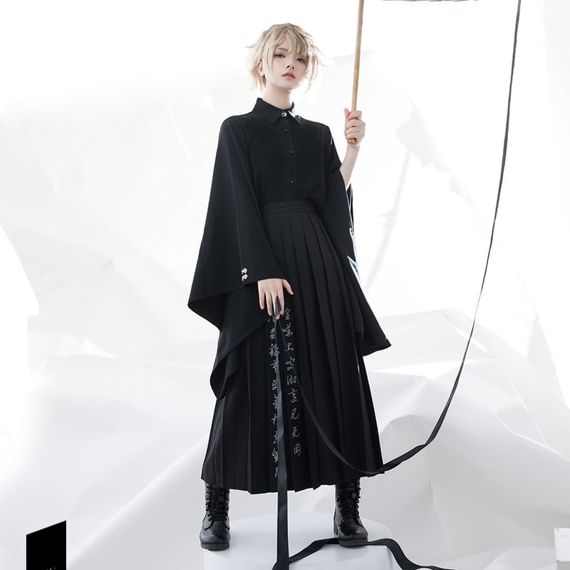 凛々しいスタンドカラー: 首元は**スタンドカラー(立ち襟)**仕様で、首元をシャープに演出。ジャケットやベストと重ね着した際に、凛とした軍服風の雰囲気を際立たせます。