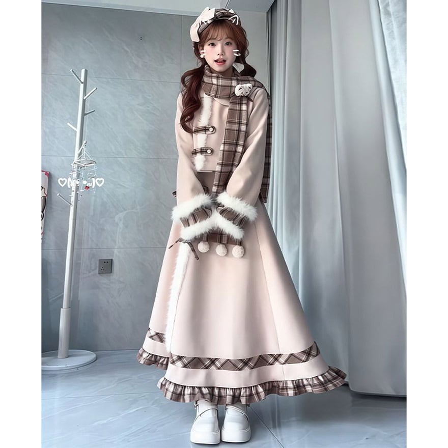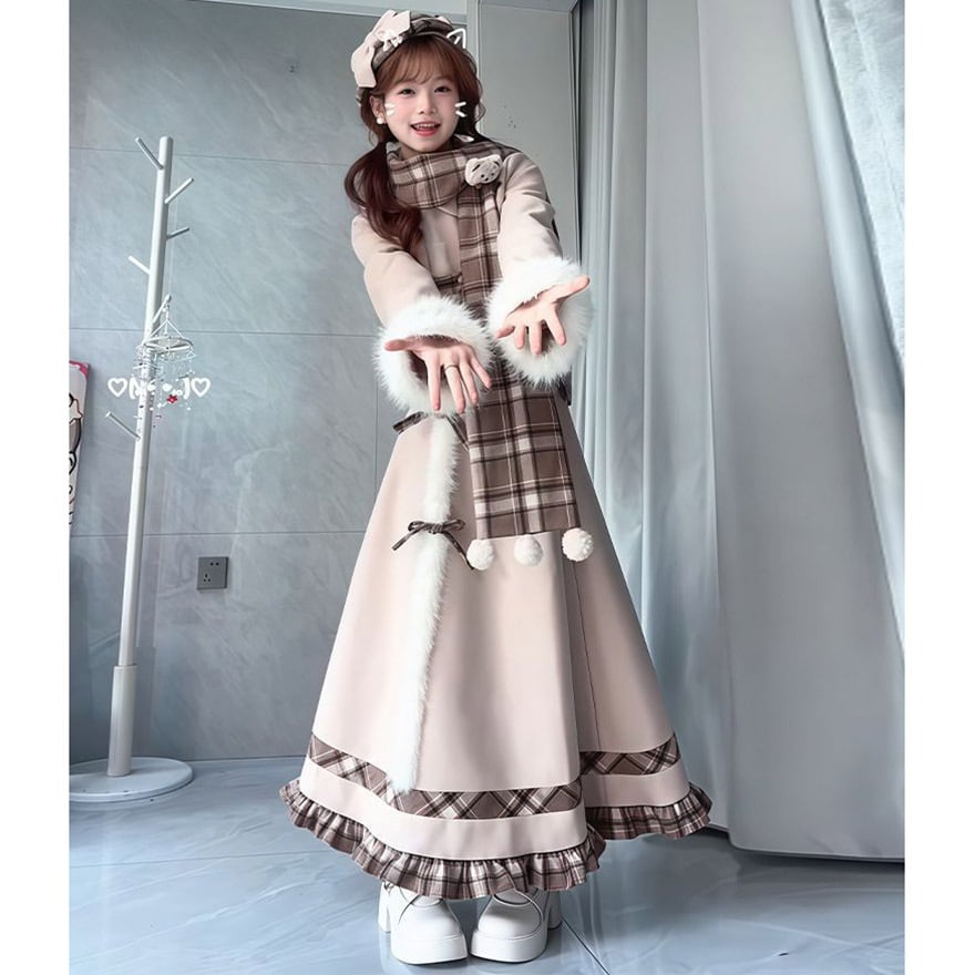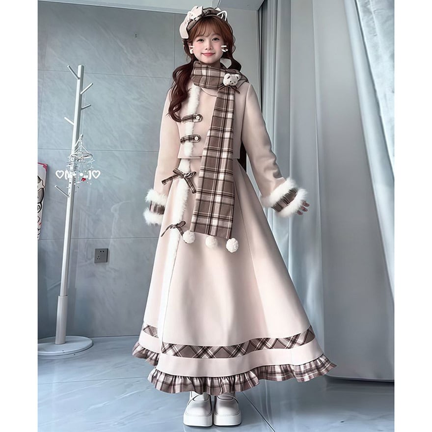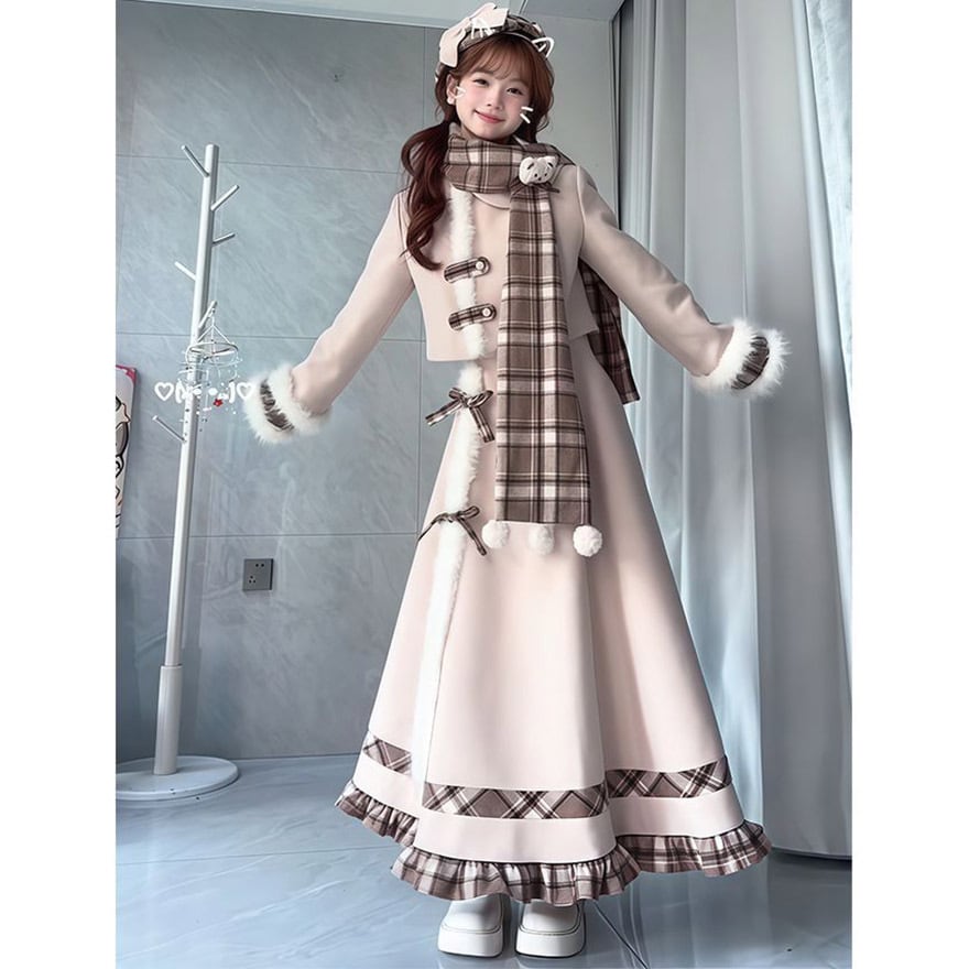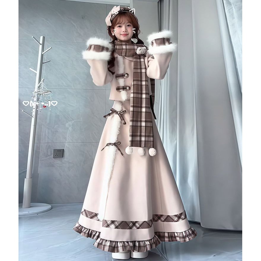 襟元や袖口、スカートの縦ラインにあしらわれた真っ白なファーとリボンが、冬らしい季節感と愛らしさをプラス。お揃いのチェック柄マフラーも付いた豪華な3点セットです。