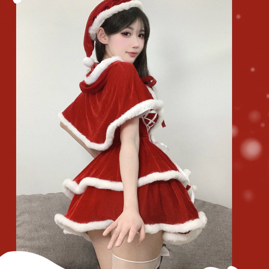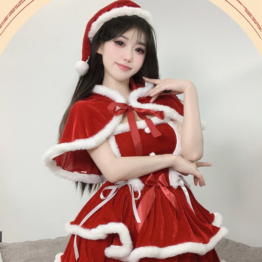 ふんわり広がるティアードスカートと、お揃いのショートケープ、サンタ帽子の3点がセットになっており、届いたその日から本格的なサンタガールに変身できます。