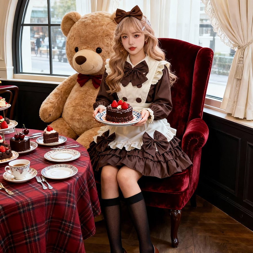 甘すぎないクラシカルな可愛さは、まるで洋菓子店の看板娘のような雰囲気を演出します。