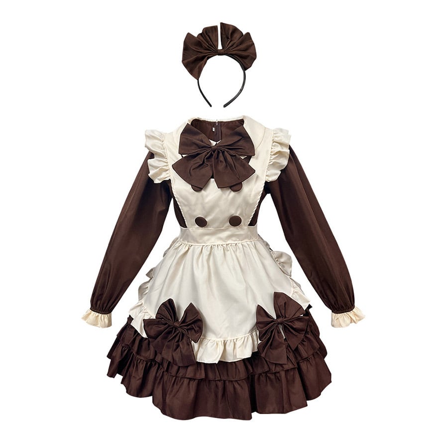 濃厚なチョコレートブラウンのワンピースに、クリームのようなアイボリーのエプロンを合わせた、まるでスイーツのような配色のメイドコスチュームです。