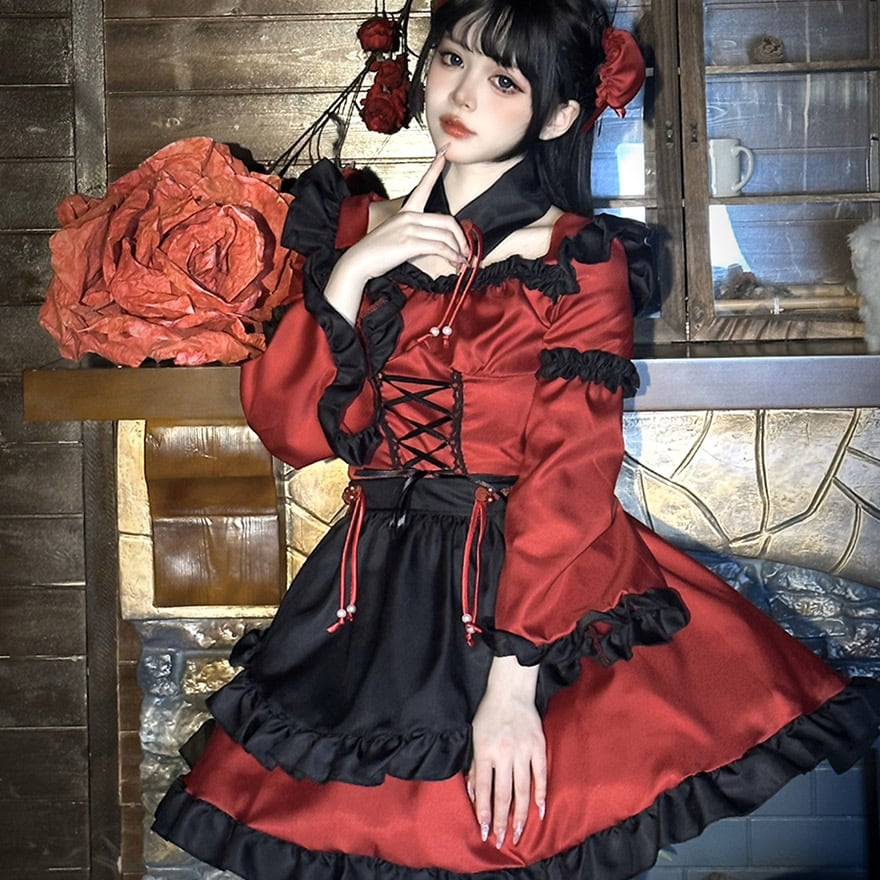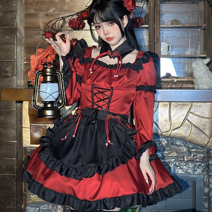 深みのあるレッドのサテン生地に、ブラックのフリルとエプロンを重ねた、中華風デザインのセットアップ衣装です。