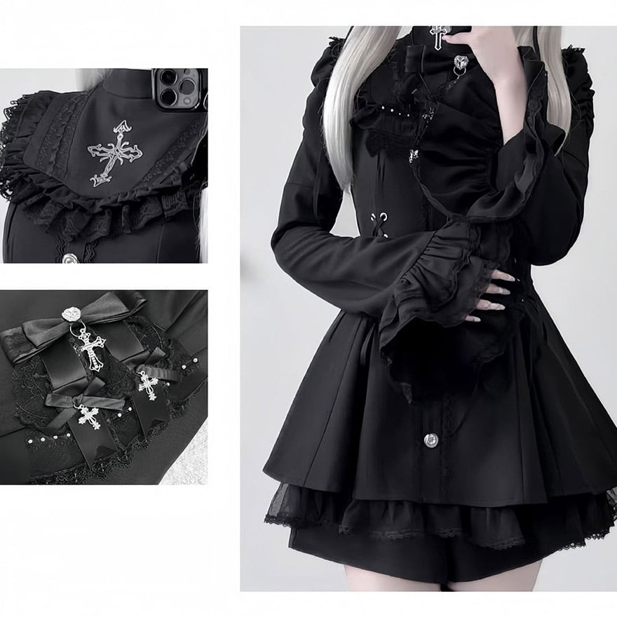 胸元のリボンや十字架のアクセサリーがアクセントになり、着るだけでダークファンタジーの主人公のような装いが完成します。