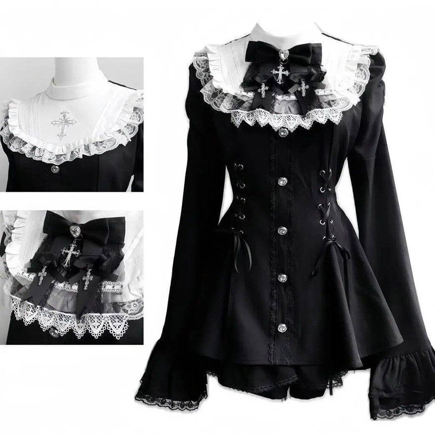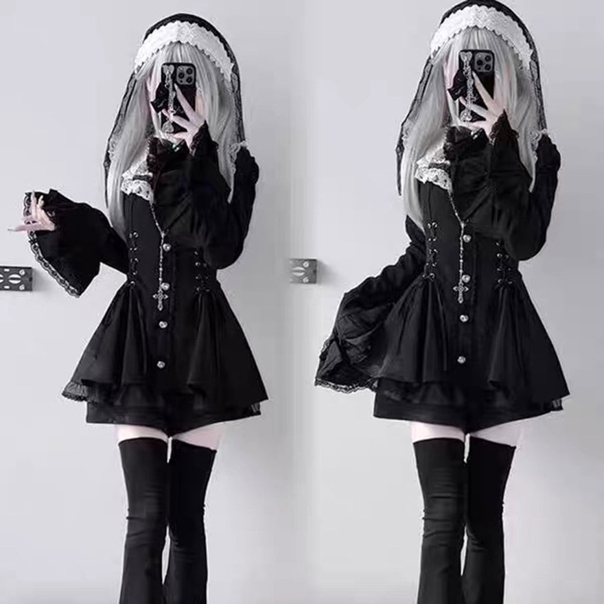 神聖なシスターの要素を取り入れつつ、短めの丈感やゴシックな装飾で「病み可愛い」世界観を表現した一着。