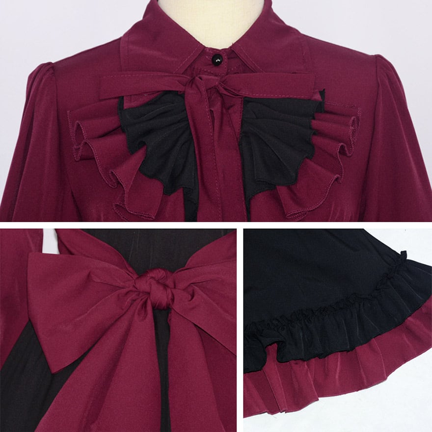 胸元: 立ち襟のブラウスに、幾重にも重なる深紅と漆黒のフリルがあしらわれています。さらに、長めのリボンタイ(ボウタイ)が付属し、顔周りを華やかに彩ります。