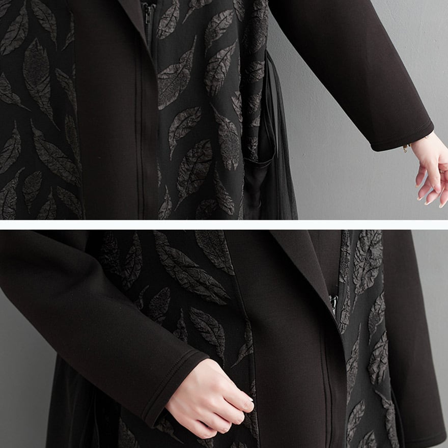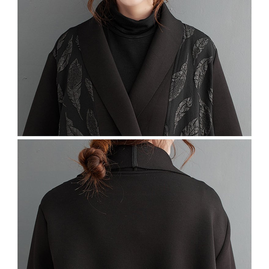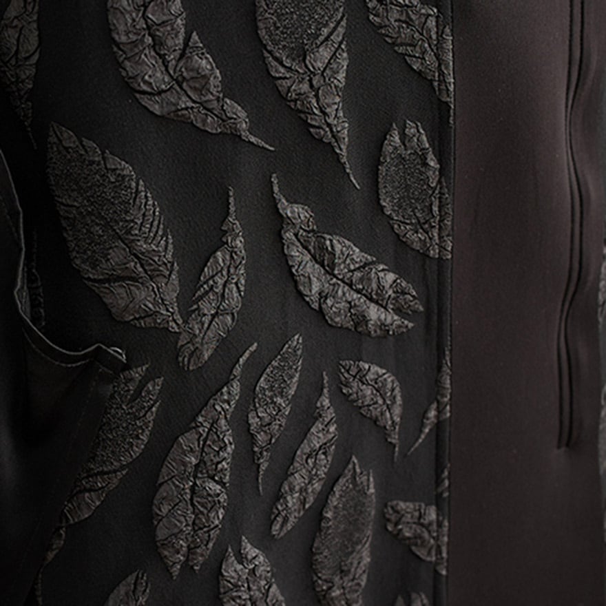 本体生地は、マットなブラックの地に、艶のあるリーフモチーフ(葉柄)が織り込まれた、立体感のある素材を使用しています。光の当たり方で柄が浮かび上がり、深みと高級感のあるゴシックな雰囲気を醸し出します。ブラウスやワンピースの上に羽織るだけで、コーデ全体にモードな重厚感を与えます。