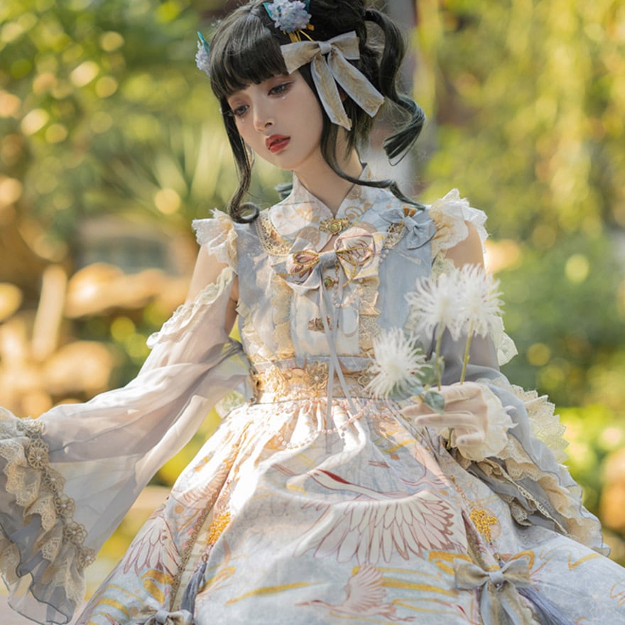 伝統的な東洋の美意識と、ロリータファッションの甘美な装飾が融合した、豪華絢爛な**華ロリタ(中華風ロリータ)**ドレスが登場。