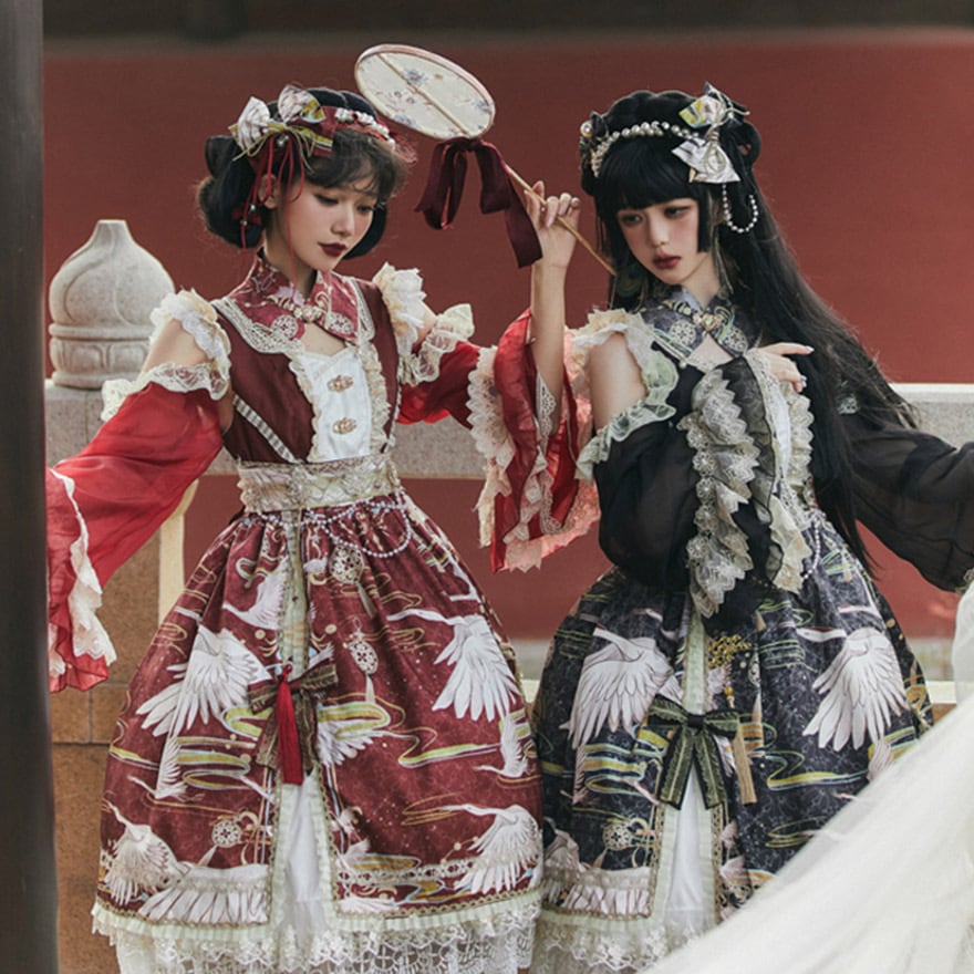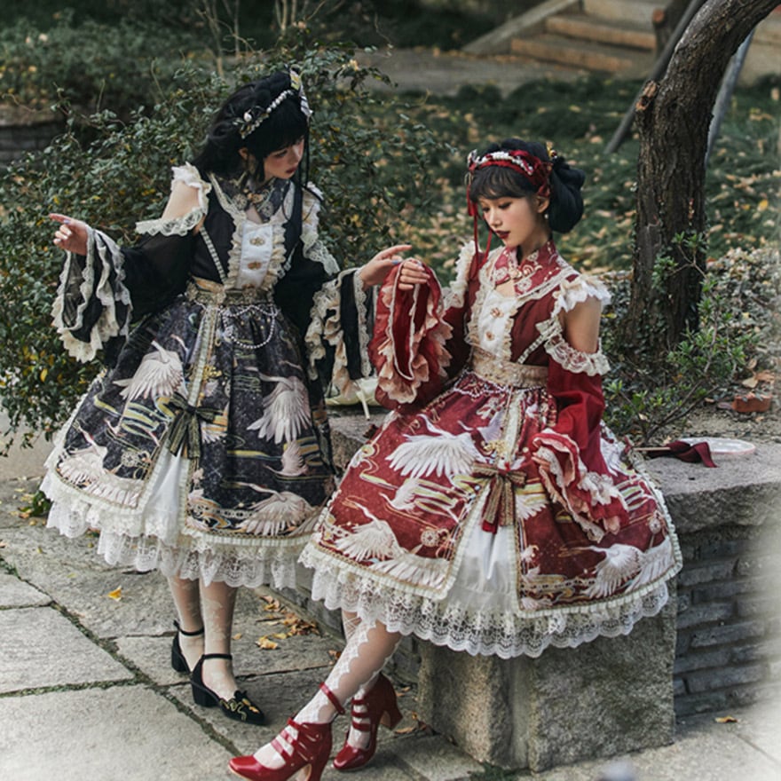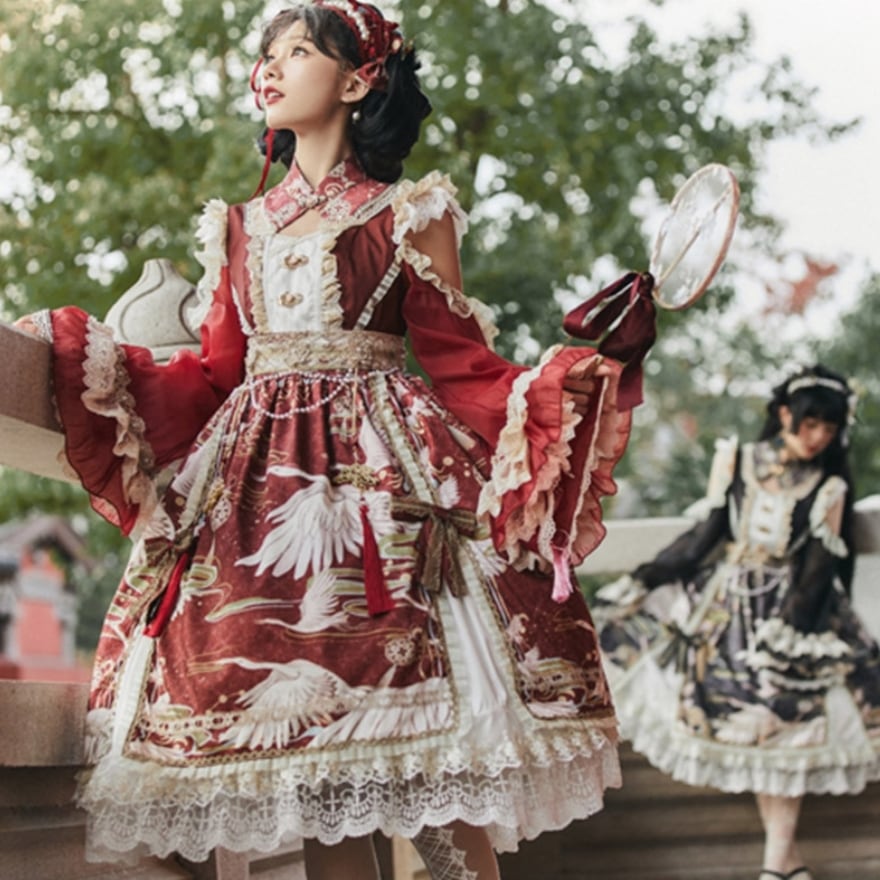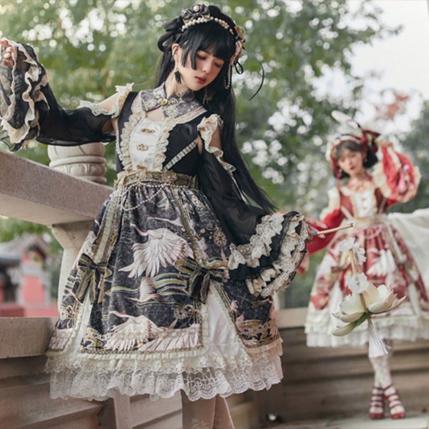 ゴシック和風 鶴柄プリント 姫袖 ロリータ ドレス 赤黒 豪華フリル 中国風
