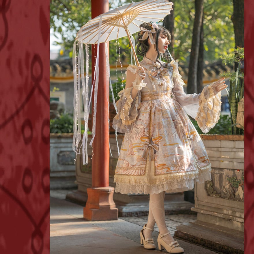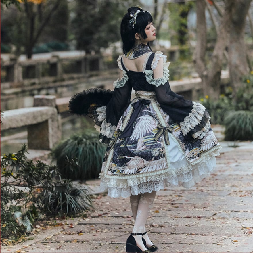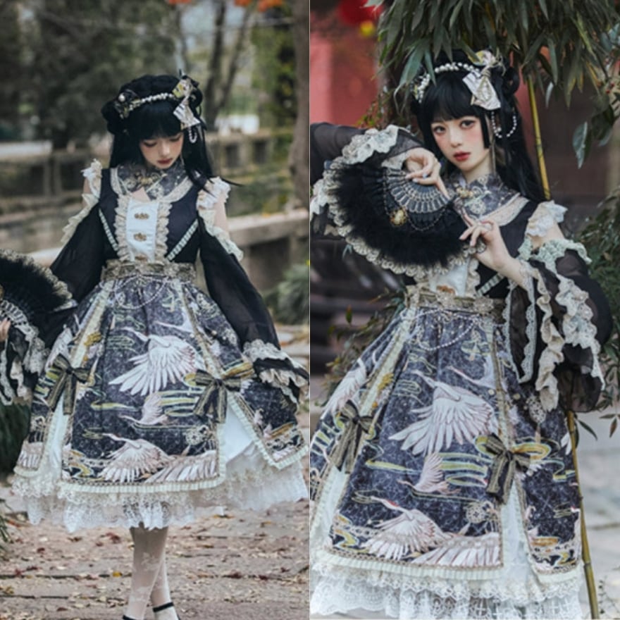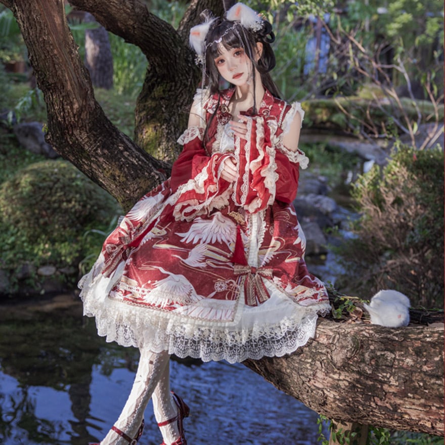 ゴシック和風 鶴柄プリント 姫袖 ロリータ ドレス 赤黒 豪華フリル 中国風