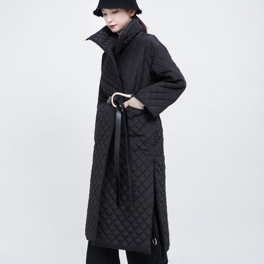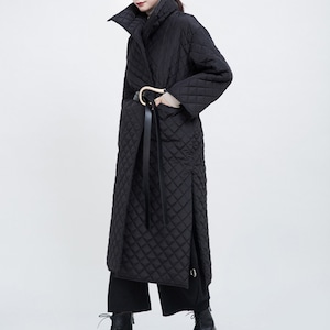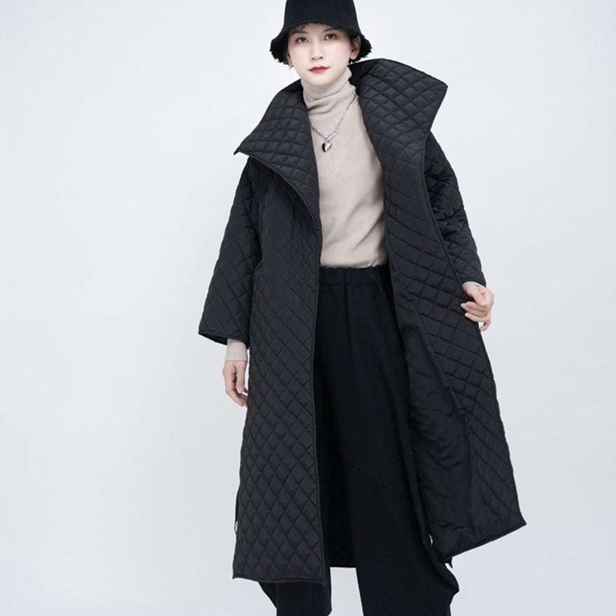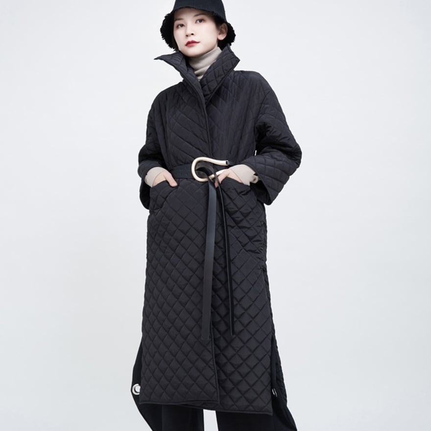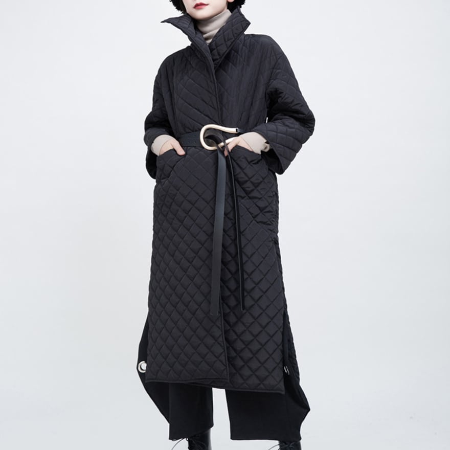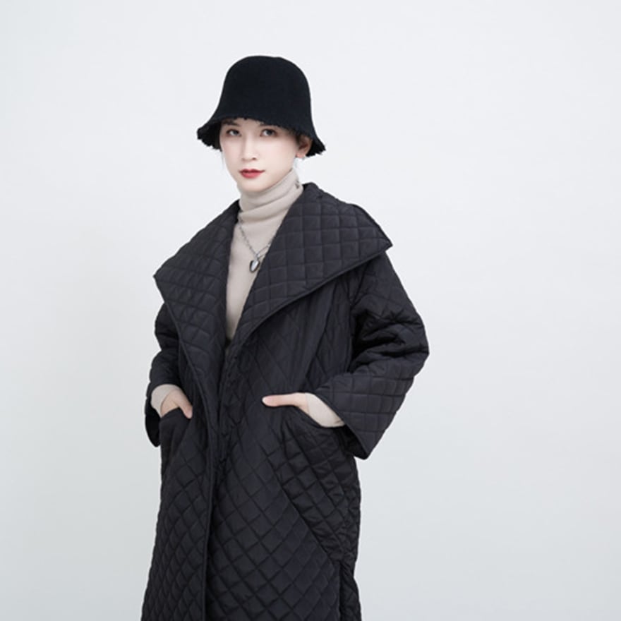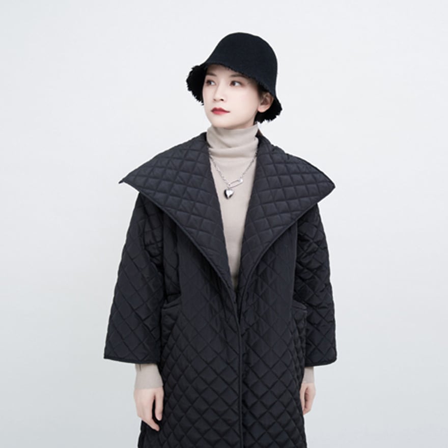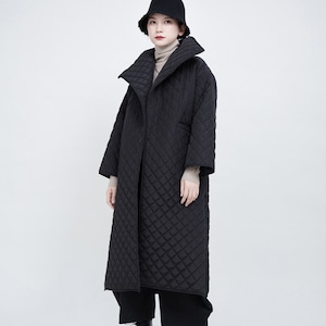 シックなブラック生地全体に施されたダイヤ柄のキルティングが目を惹く、ロング丈のコートです。