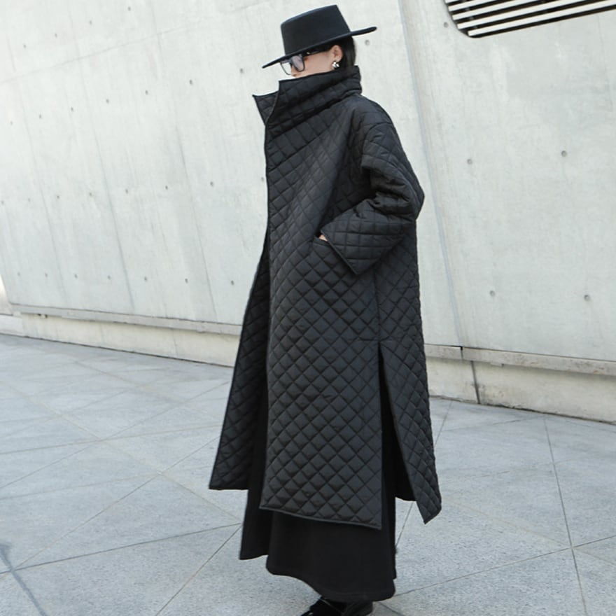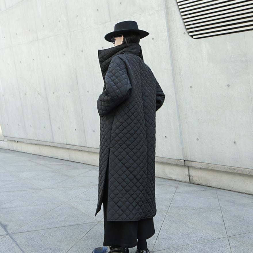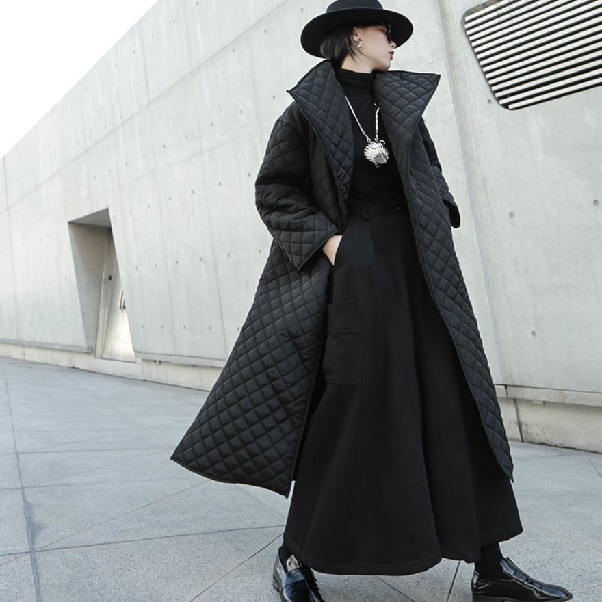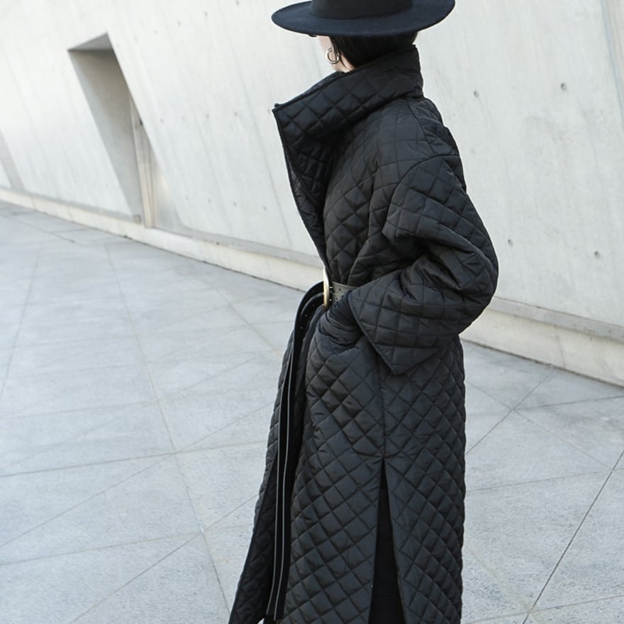 マットな質感のブラック生地にダイヤ柄のキルティングを施した、ロング丈のモード系コートです。