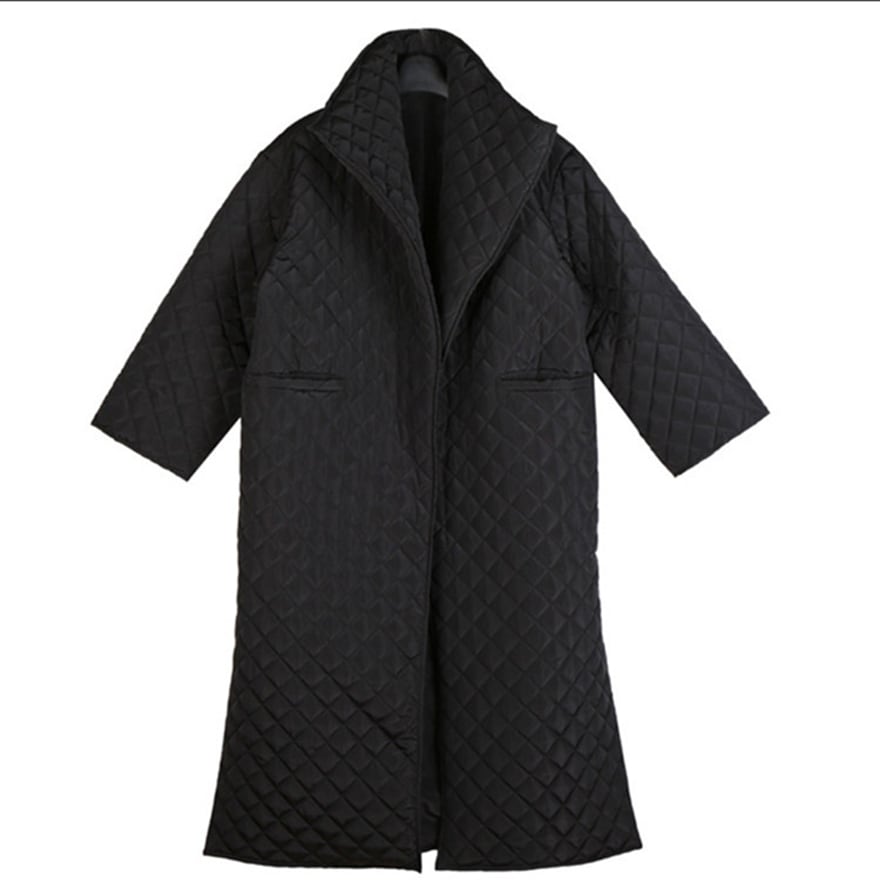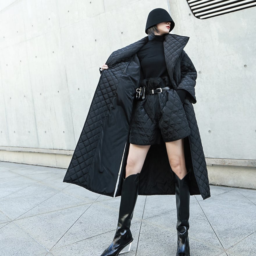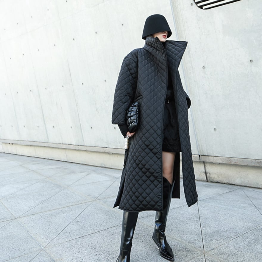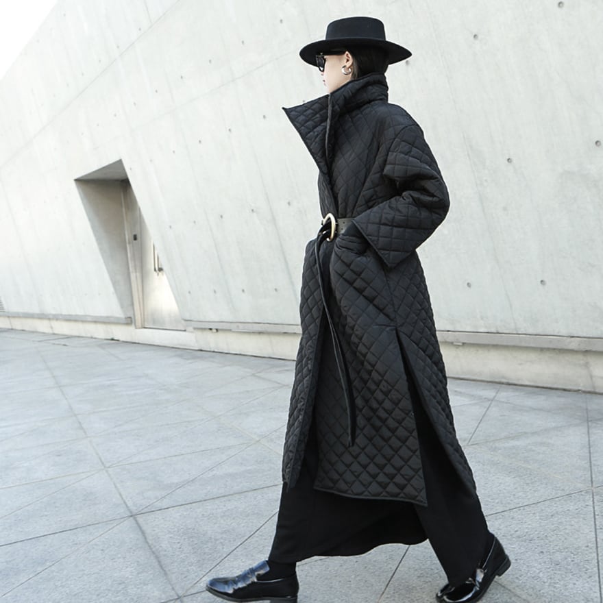 マットな質感のブラック生地にダイヤ柄のキルティングを施した、ロング丈のモード系コートです。