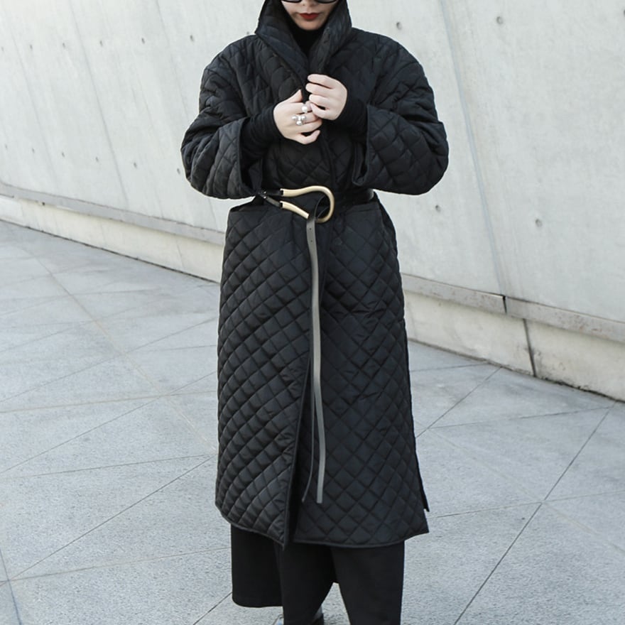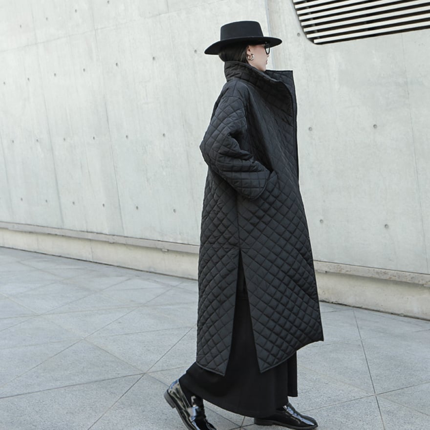 関連キーワード: #モード系 #ゴシック #キルティングコート #ロングコート #サイドスリット #黒コーデ #大人カジュアル #通勤 #秋冬アウター