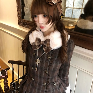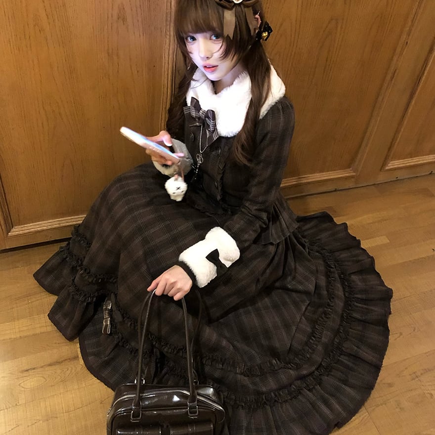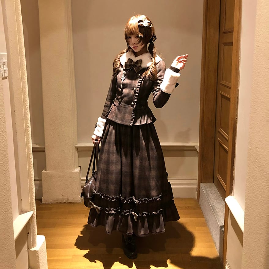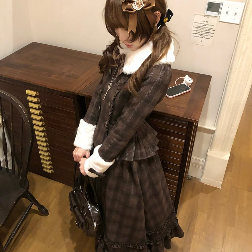 関連キーワード: #クラロリ #森ガール #セットアップ #チェック柄 #チョコレートカラー #ファー #ロングスカート #冬コーデ #文学少女 #可愛い