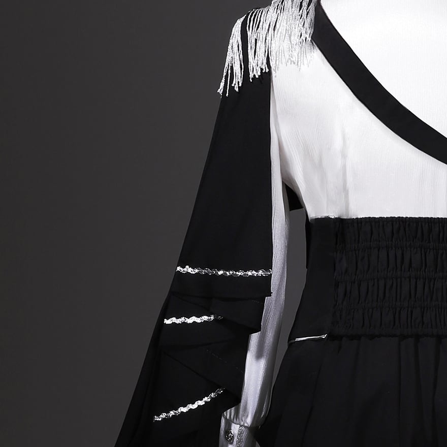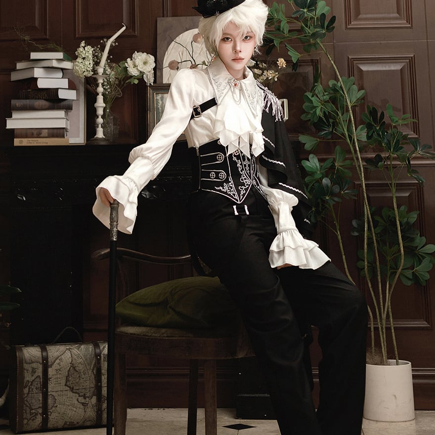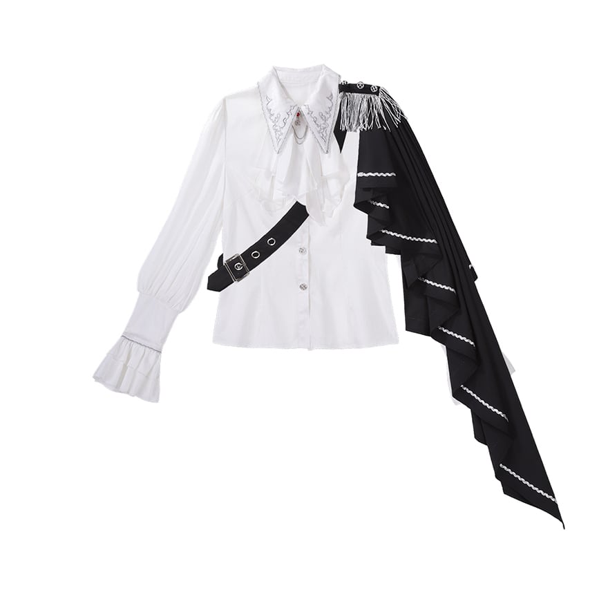 純白のフリルブラウスに、流れるような黒のドレープがアシンメトリーに映える、トップス・コルセットベルト・パンツの豪華3点セットです。