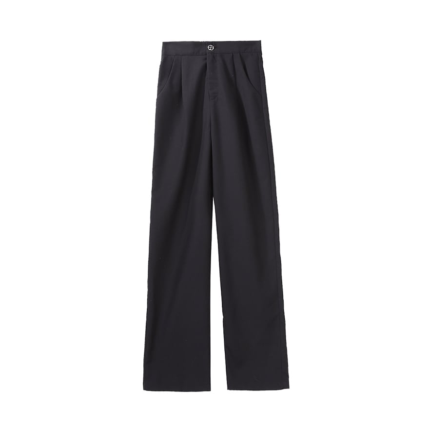 袖口のフリルや揺れるドレープが優雅さを演出しつつ、スラリとしたパンツスタイルが凛とした美しさを引き立てる、計算されたデザインです。