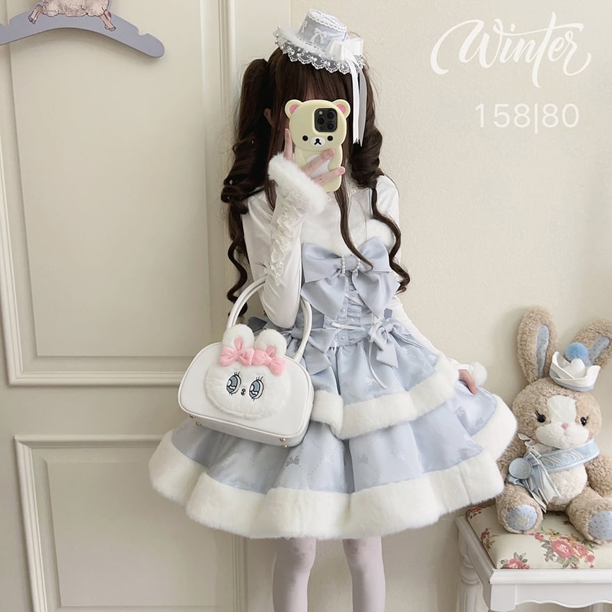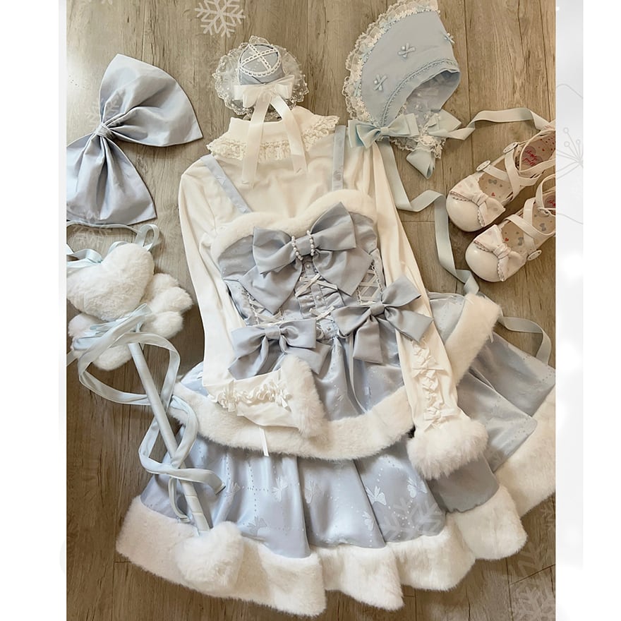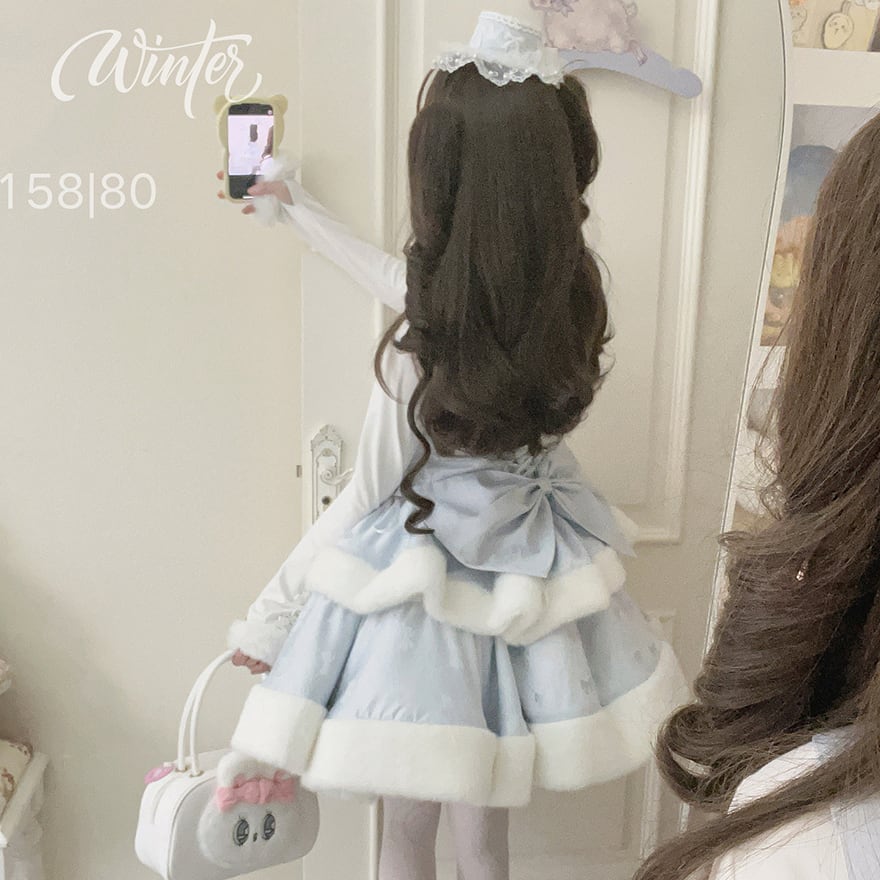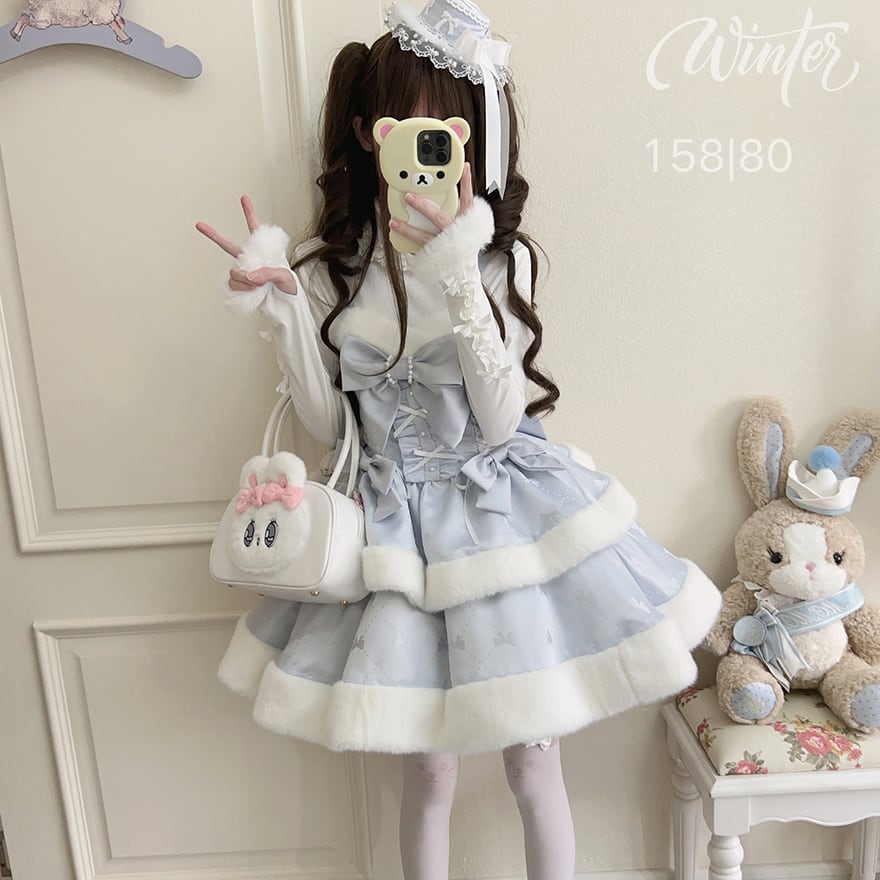 淡いパステルブルーのジャンパースカートに、雪のような真っ白なファーを贅沢にあしらったセットアップです。