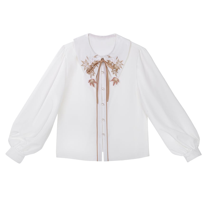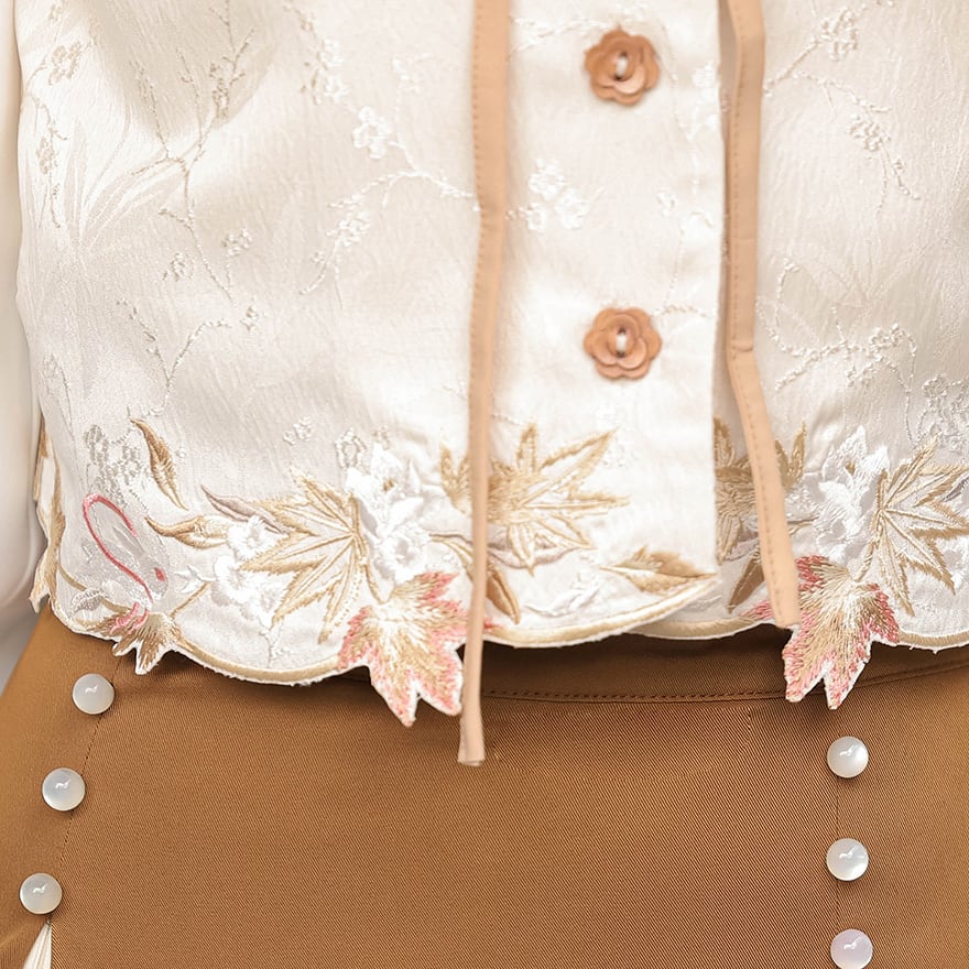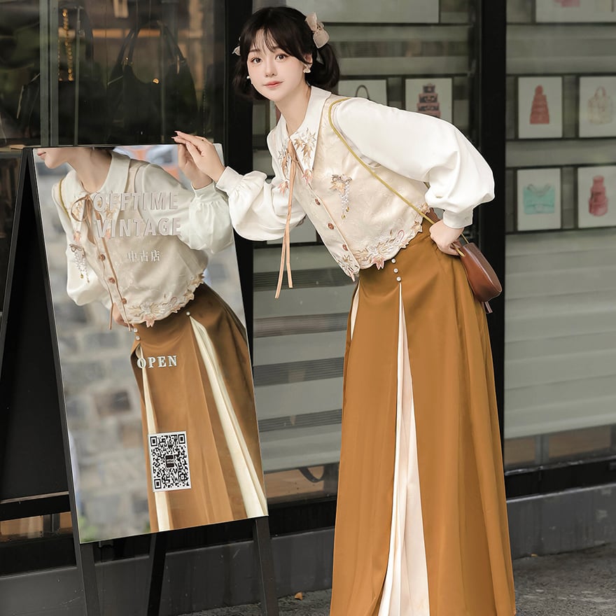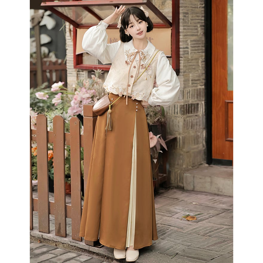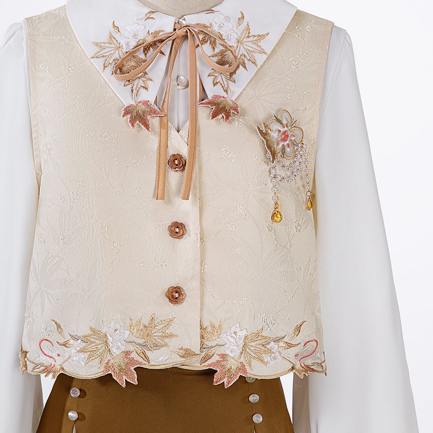 繊細な紅葉モチーフの刺繍が施されたベージュのベスト、ふんわりとしたパフスリーブのブラウス、そして落ち着いたブラウンのロングスカートの豪華3点セットです。
