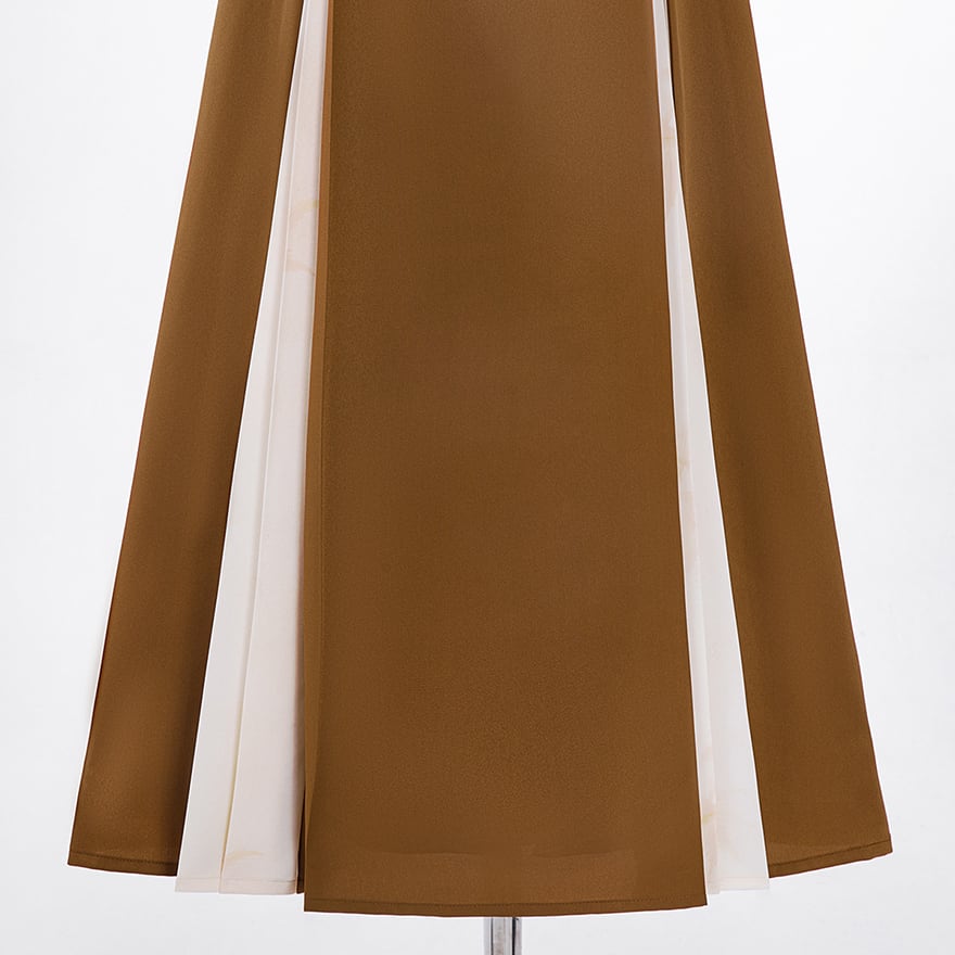 スカートにはボックスプリーツのようなスリットが入っており、動くたびに内側の生地が覗くデザインが上品な躍動感を演出します。