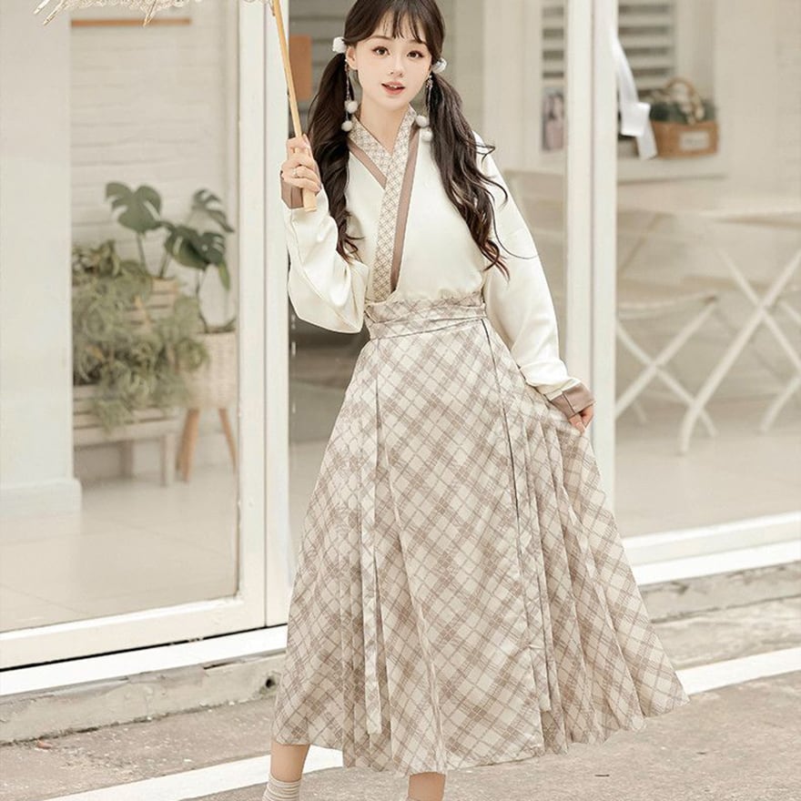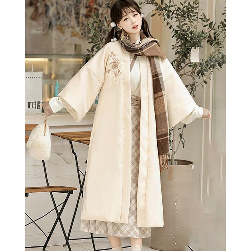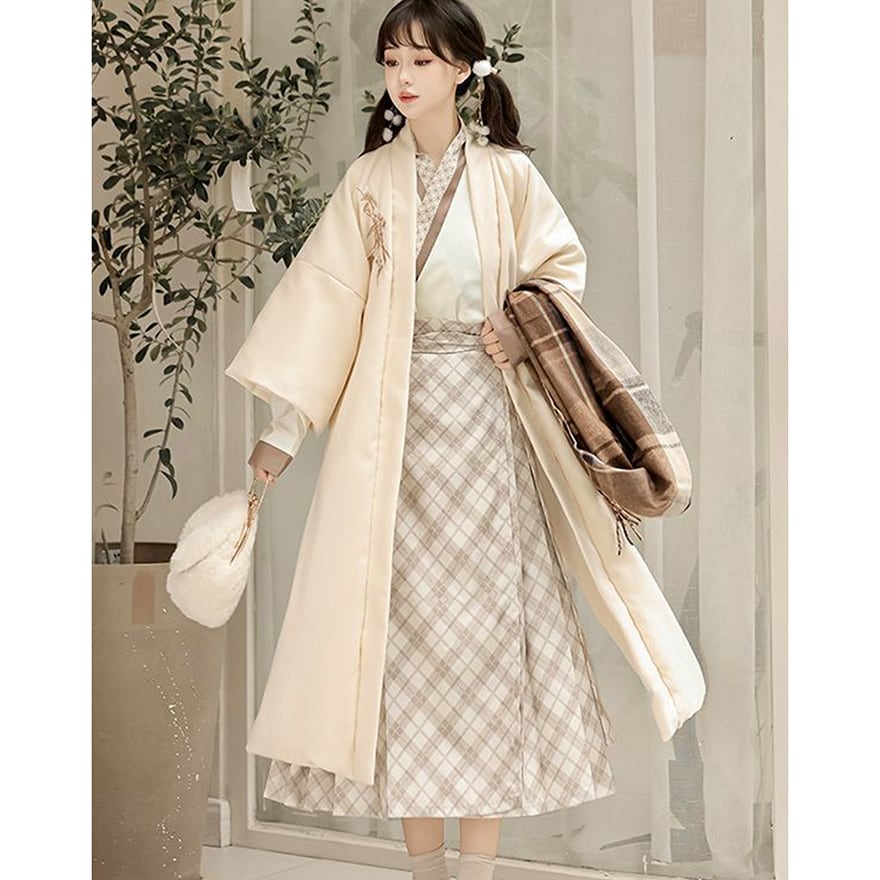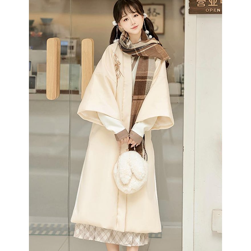 クリーム色のロングコート、交差襟のトップス、チェック柄スカート、そしてマフラーまで揃った豪華な4点セットです。