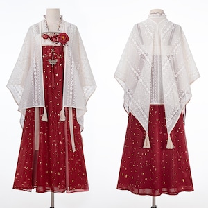目を惹く鮮やかなレッドのスカートに、金箔のような散らし模様が夜空の星のように輝く、漢服スタイルのセットアップです。