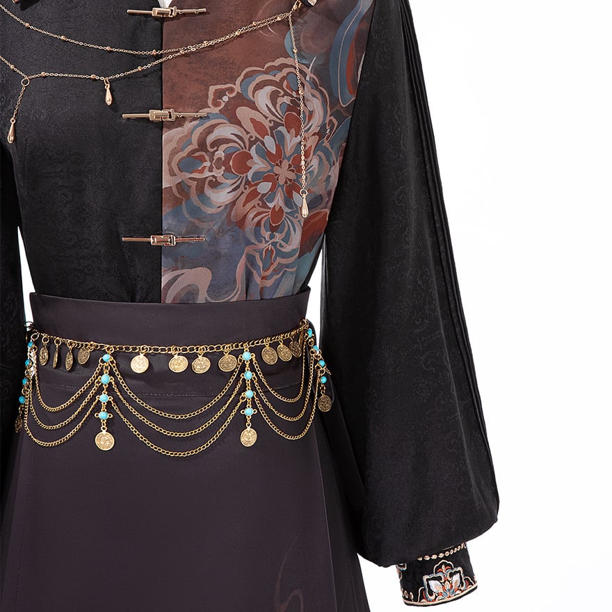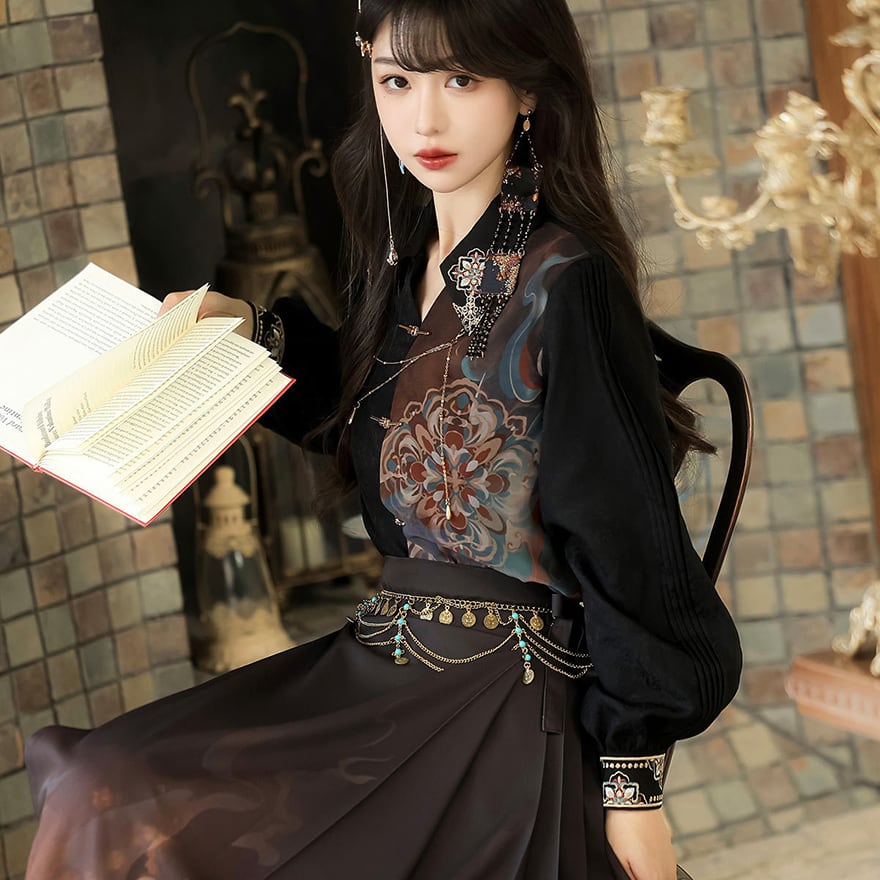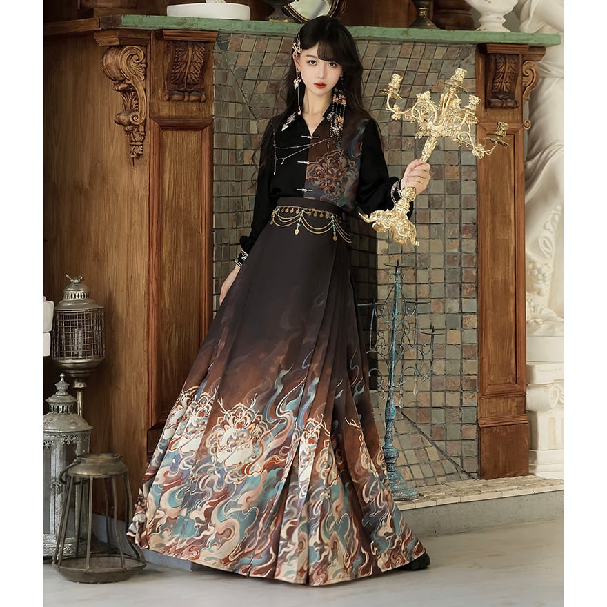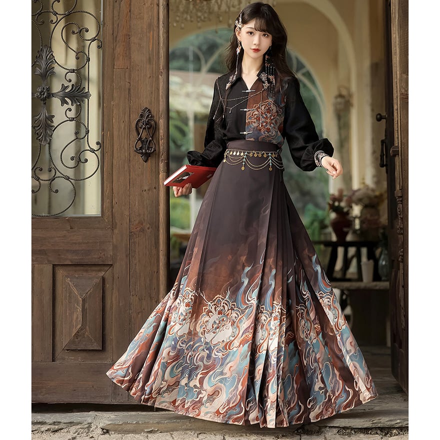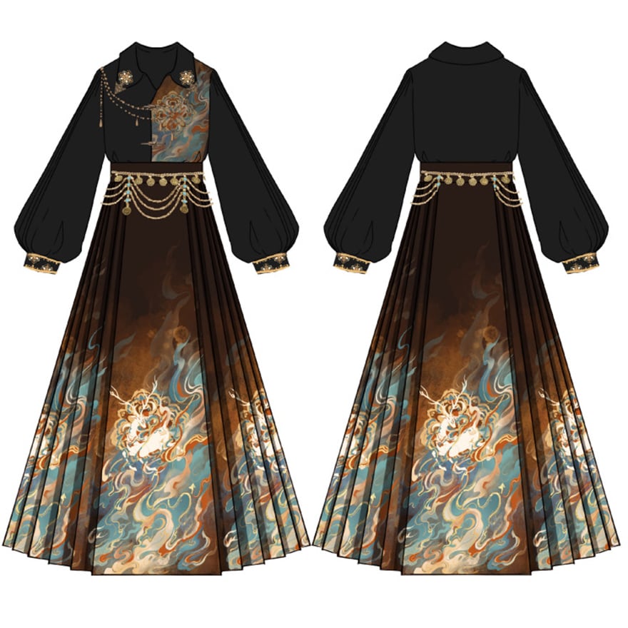 トップスにはチャイナボタンや精緻な柄があしらわれ、スカートは敦煌の壁画を思わせるような神秘的なグラデーションカラーが特徴的。