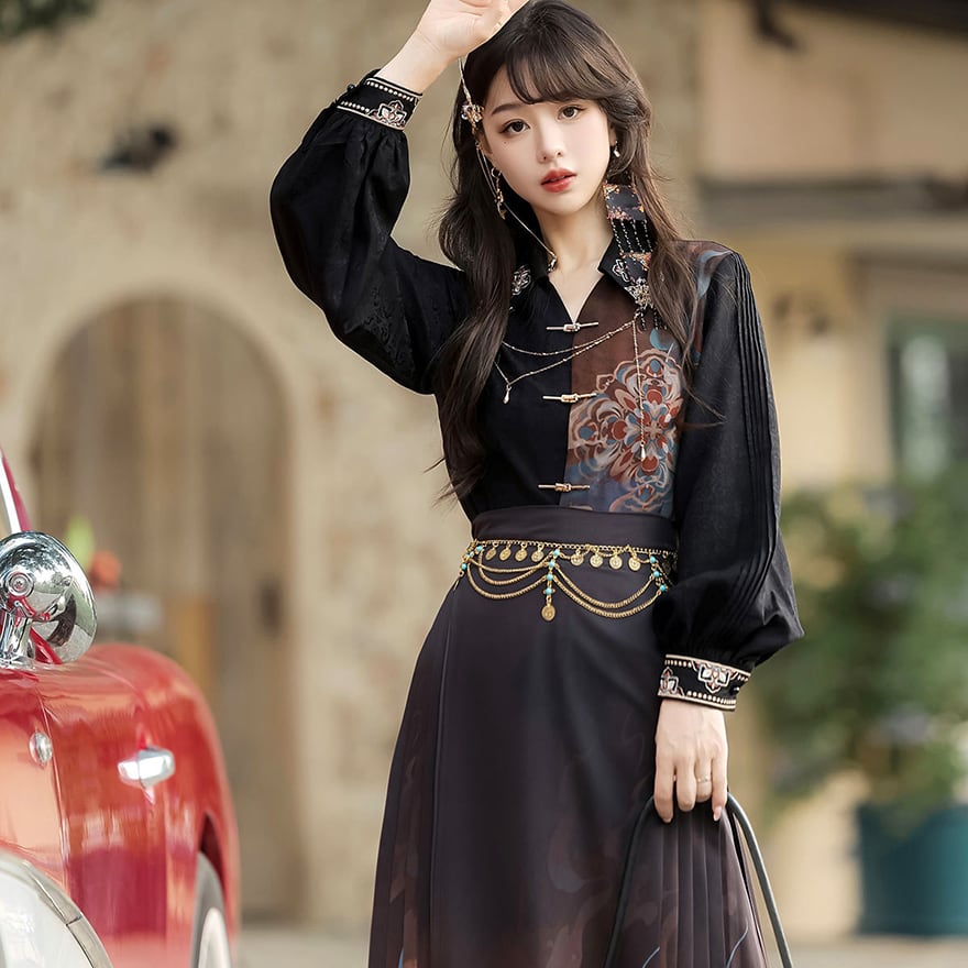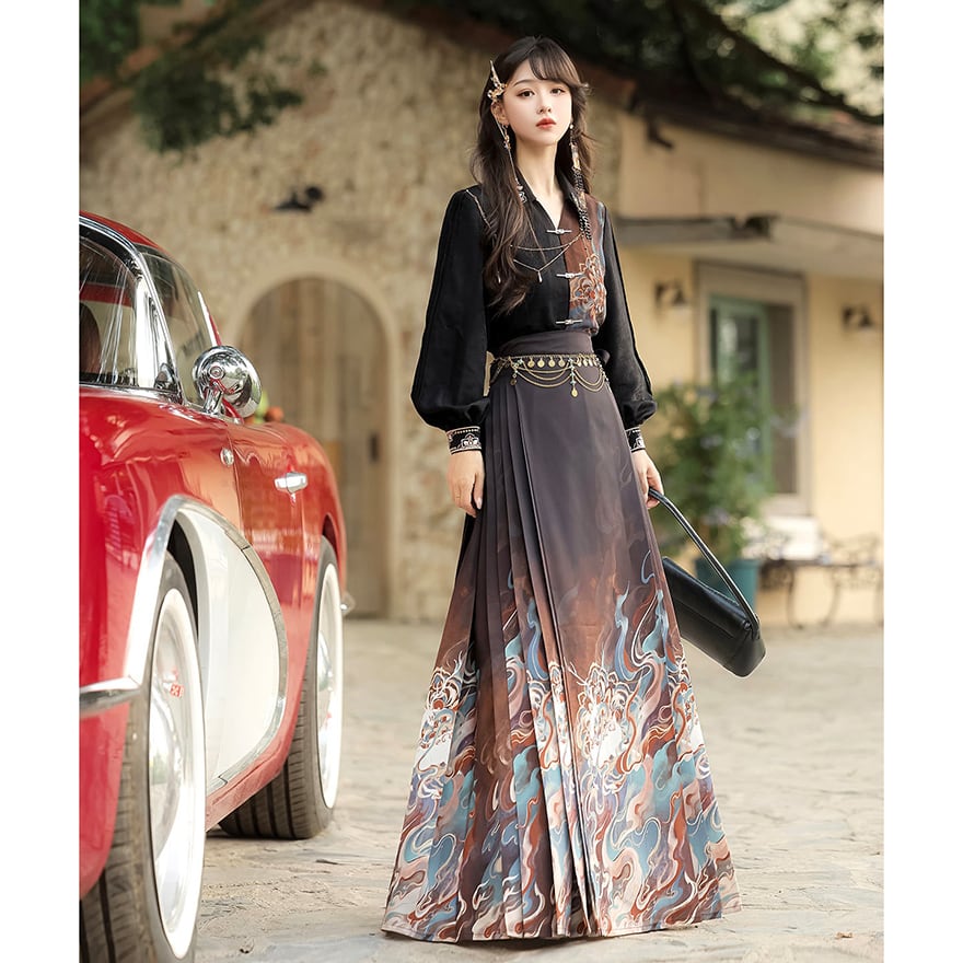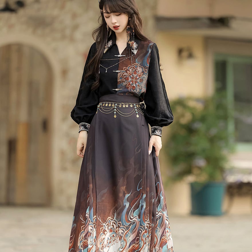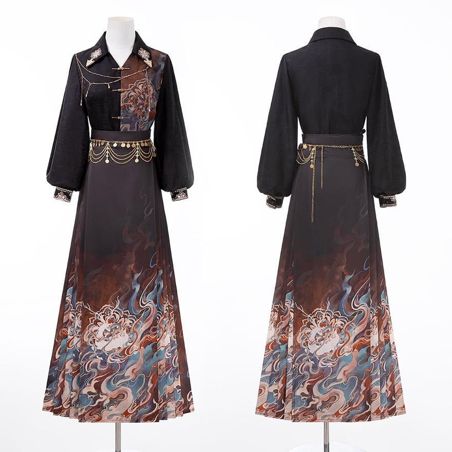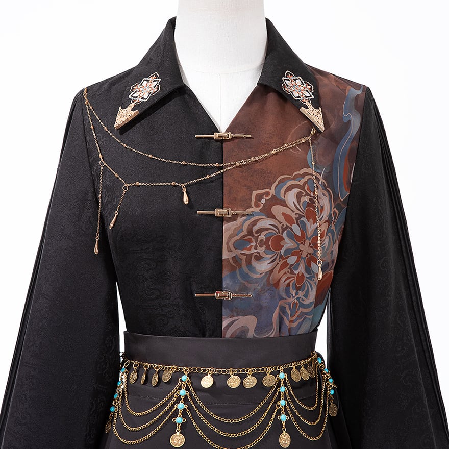 アシンメトリーな切り替えデザインが個性的な黒のトップスと、伝統的な雲炎模様がドラマチックに描かれたロングスカートのセットアップです。