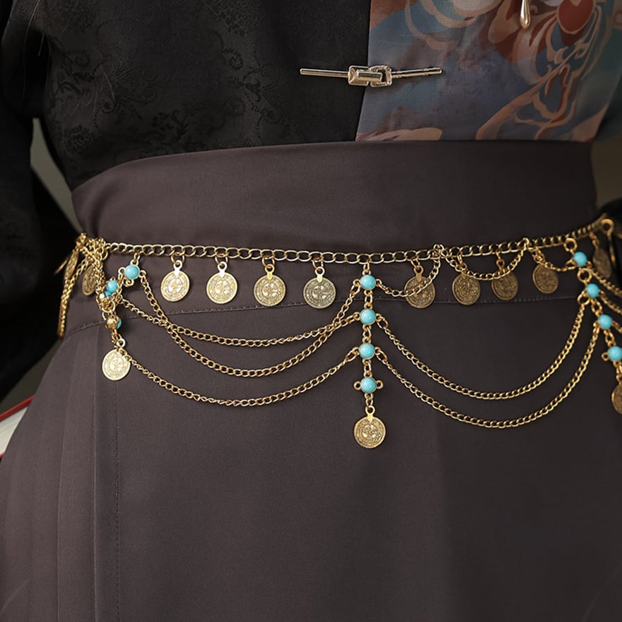 ウエストのチェーン装飾やタッセルが、動くたびにきらめき、異国情緒あふれるエスニックな美しさを引き立てます。