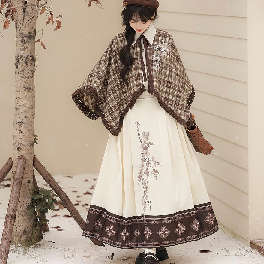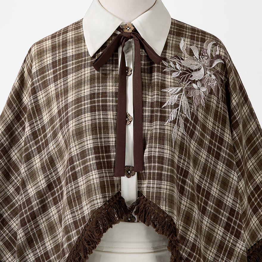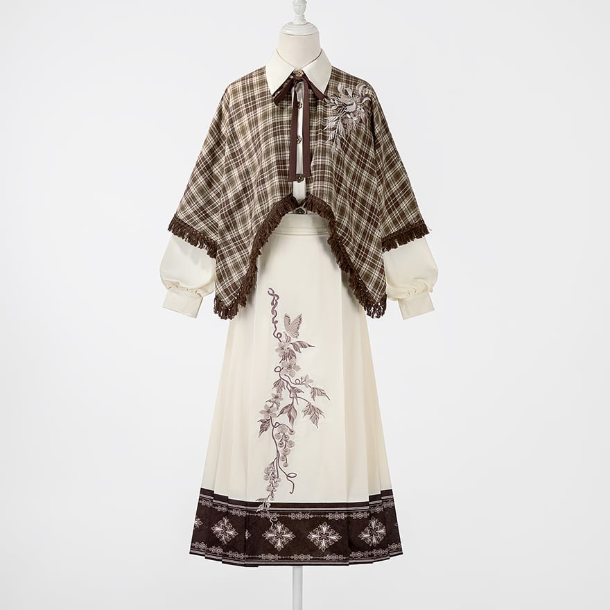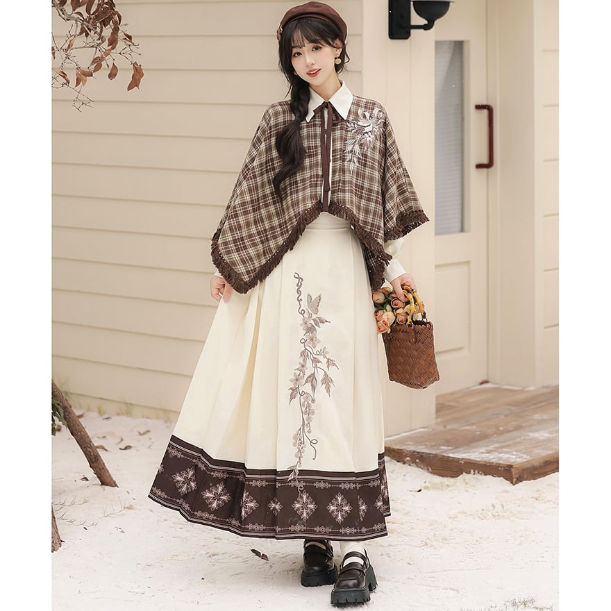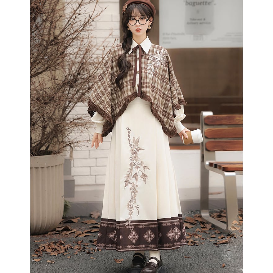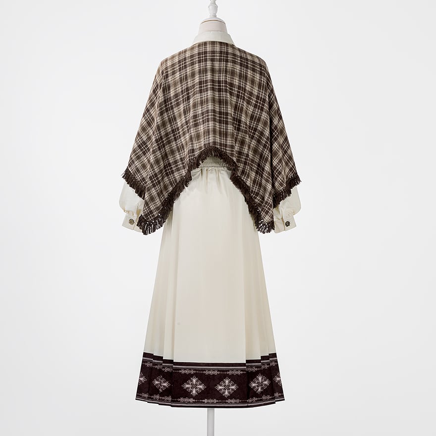 温かみのあるブラウンのチェック柄ケープ風トップスと、優美な刺繍入りのロングスカートの2点セットです。