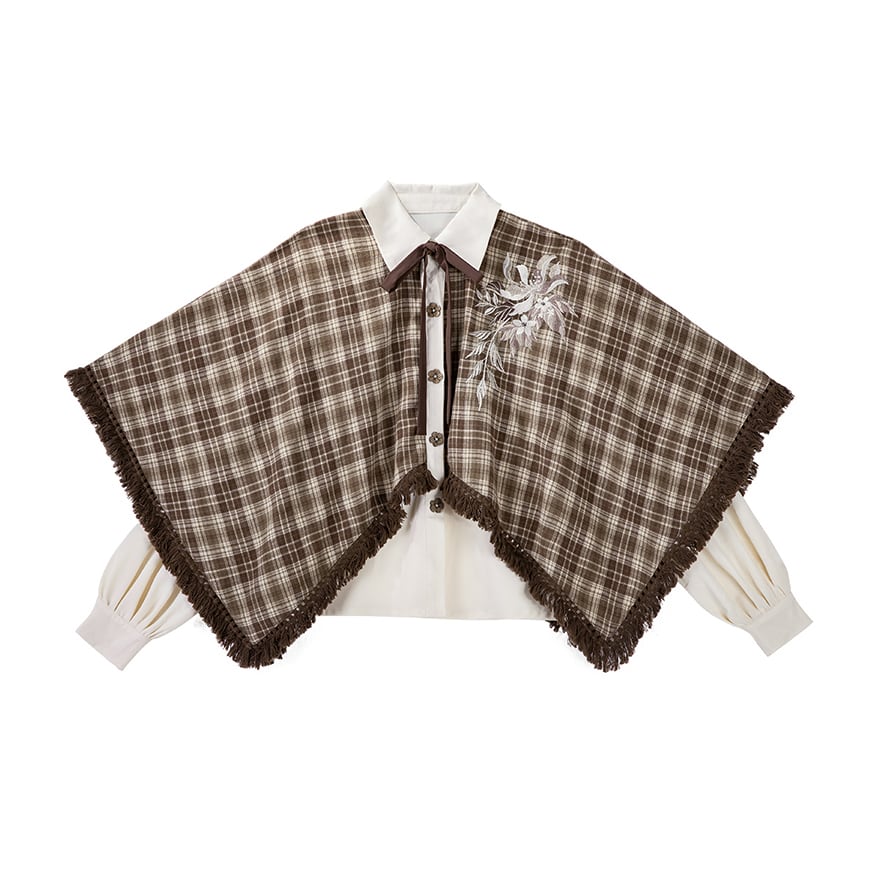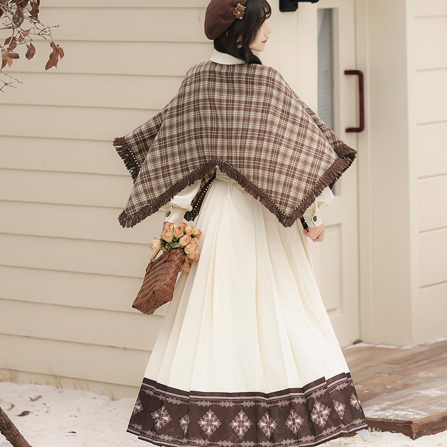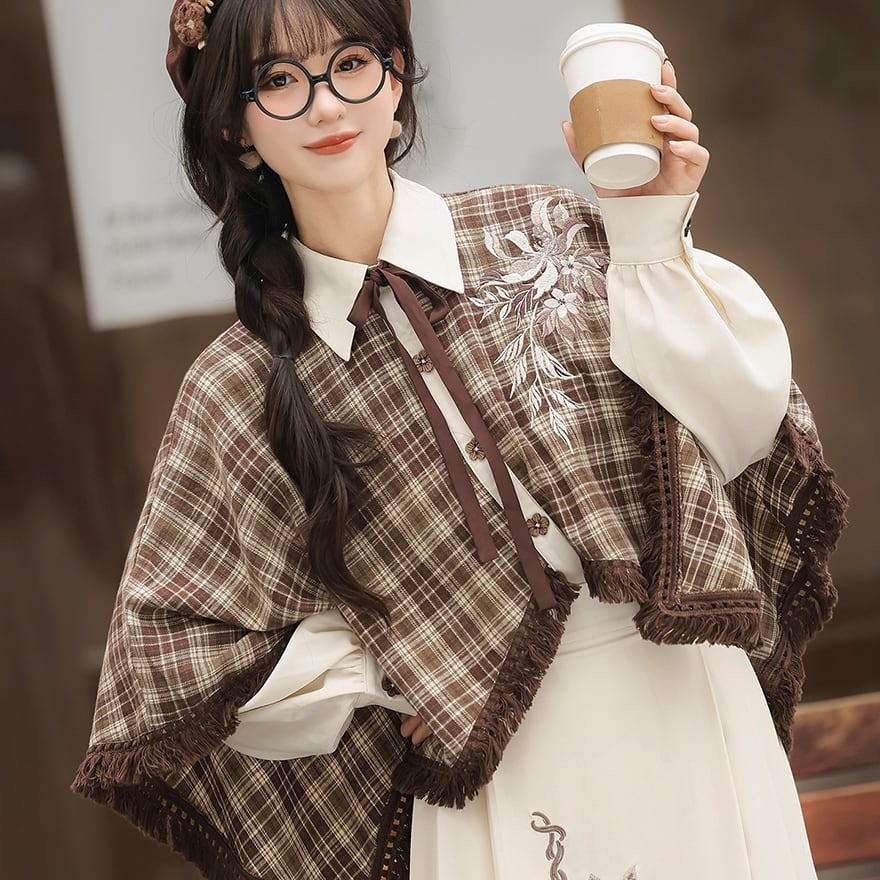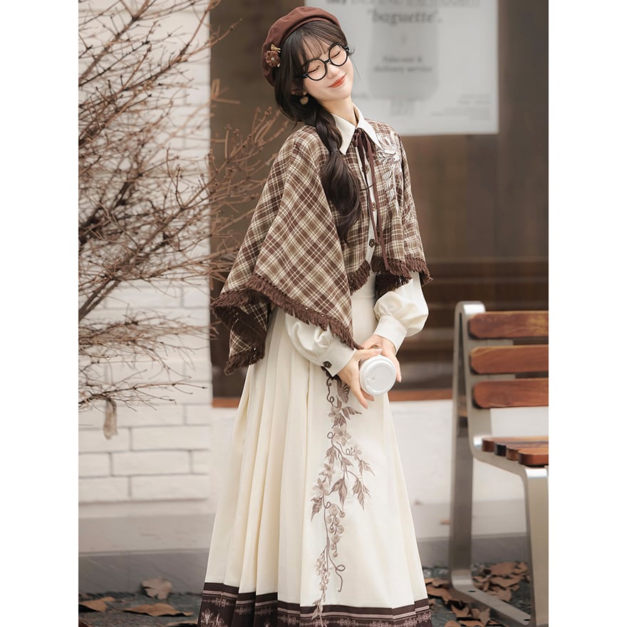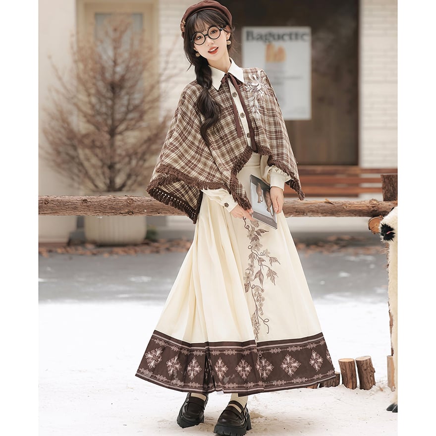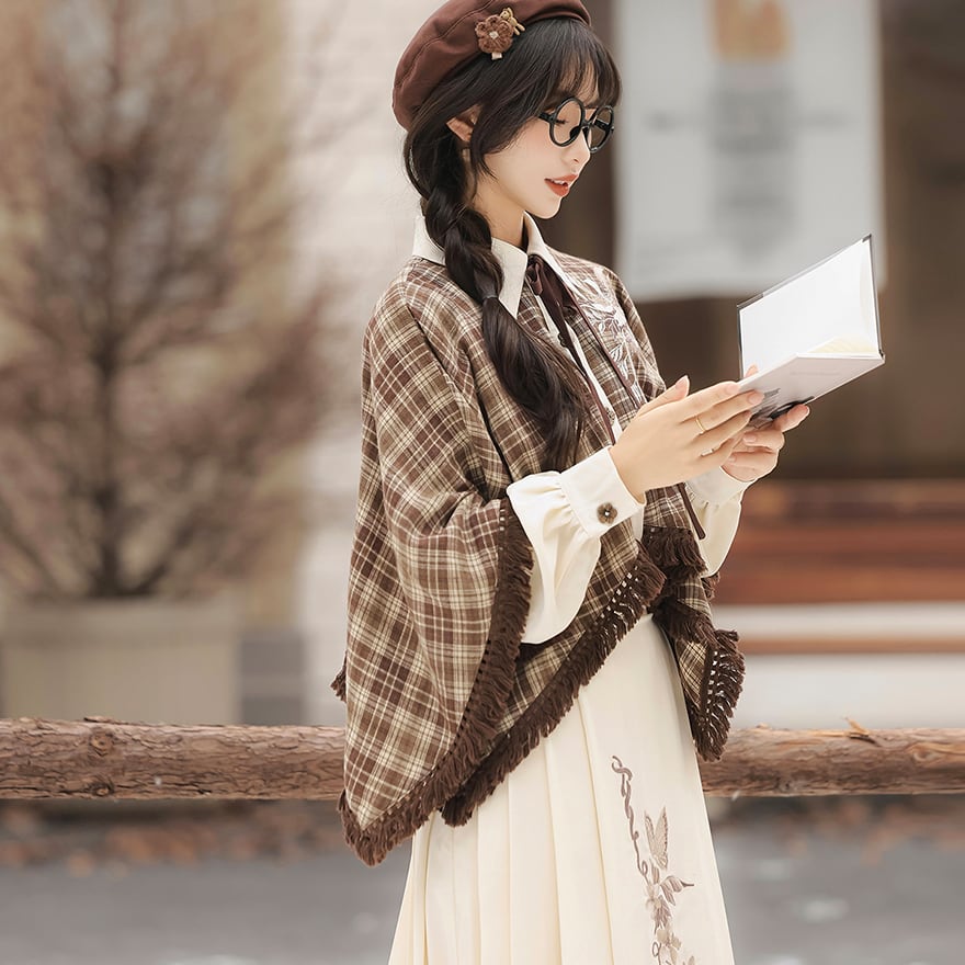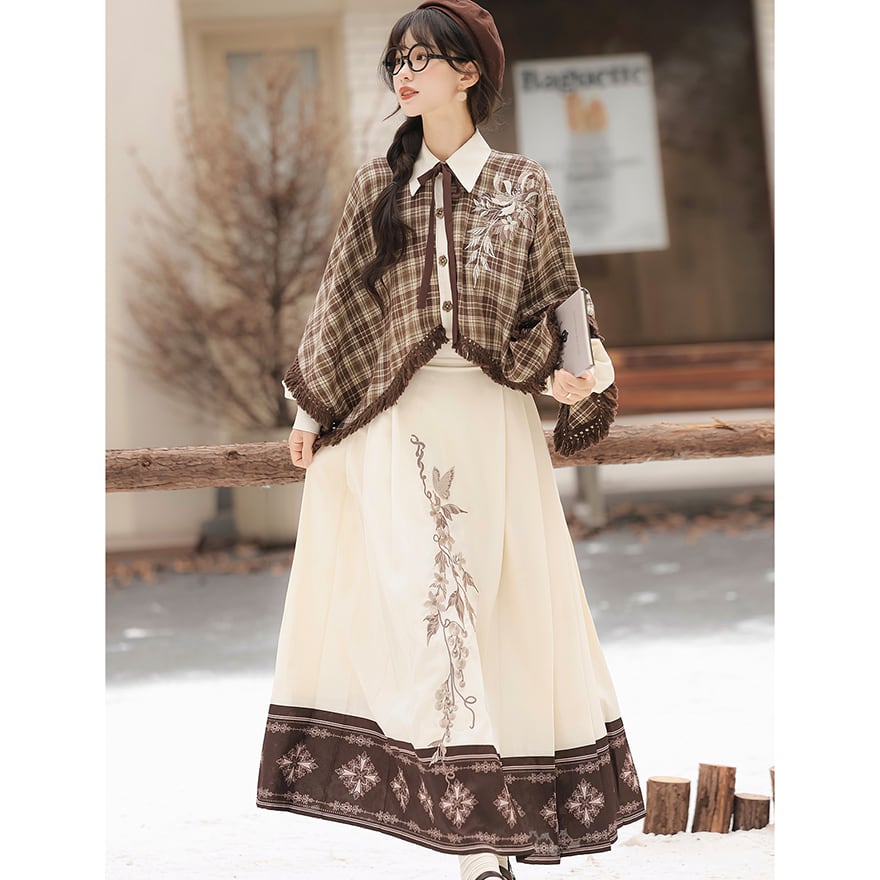 温かみのあるブラウンのチェック柄ケープ風トップスと、優美な刺繍入りのロングスカートの2点セットです。