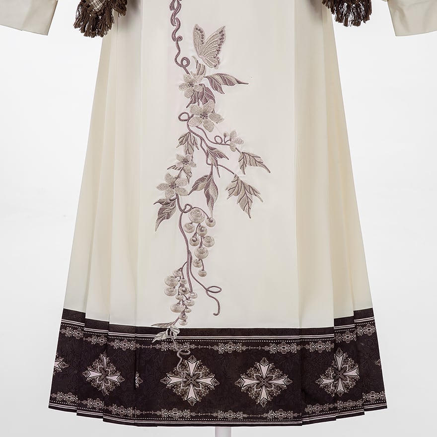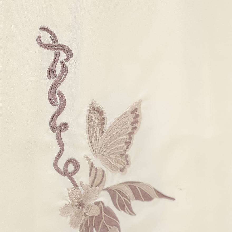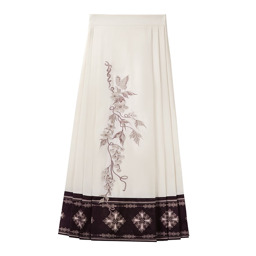 スカートはクリーム色の生地に縦に流れる植物と蝶の刺繍が施され、裾の切り替え模様が全体をシックに引き締めます。