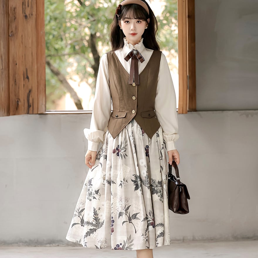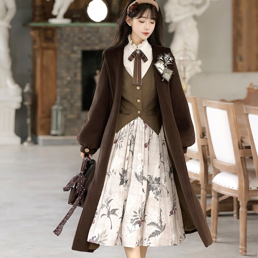 温かみのあるロングコート、シルエットを美しく見せるベスト、リボン付きブラウス、そして植物図鑑のような花柄スカートの豪華4点セットです。