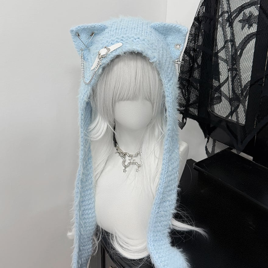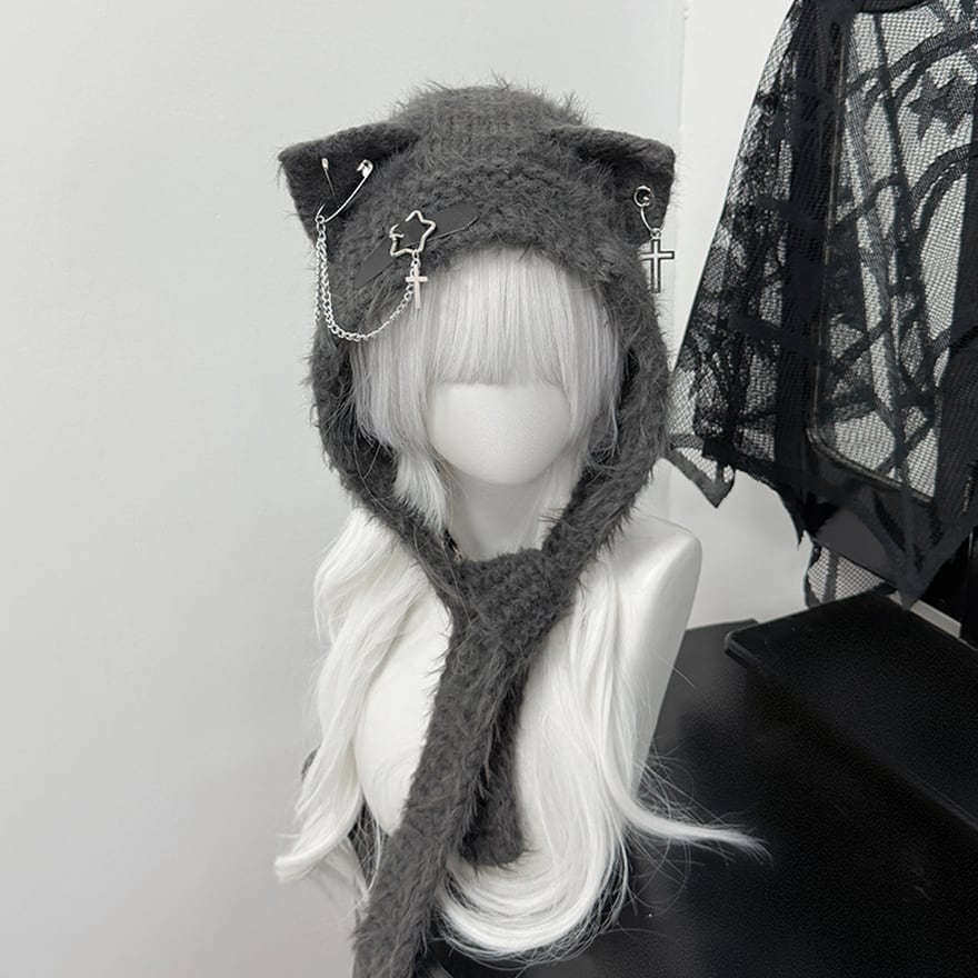 キュートなネコ耳シルエットに対し、クールなシルバーの安全ピン、チェーン、十字架チャームをあしらうことで、甘さとハードさが融合した「病みかわ」デザインに仕上げました。