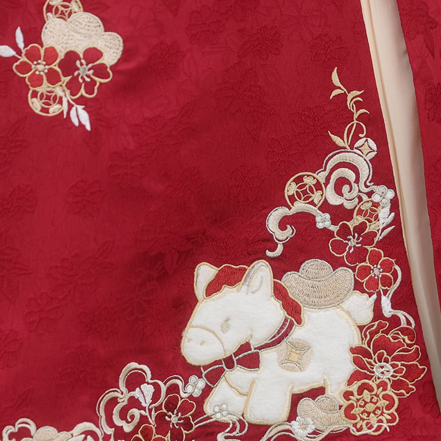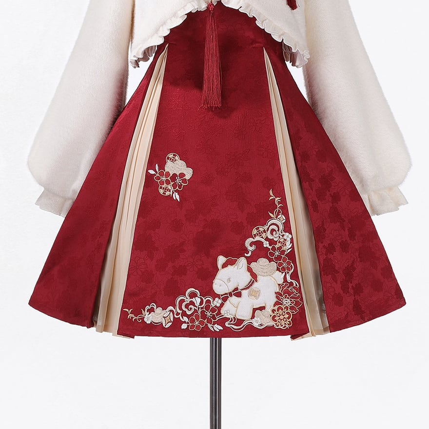スカートの裾には物語を感じさせる愛らしい馬の刺繍が施され、クリーム色のプリーツ切り替えが動くたびに軽やかな表情を見せます。