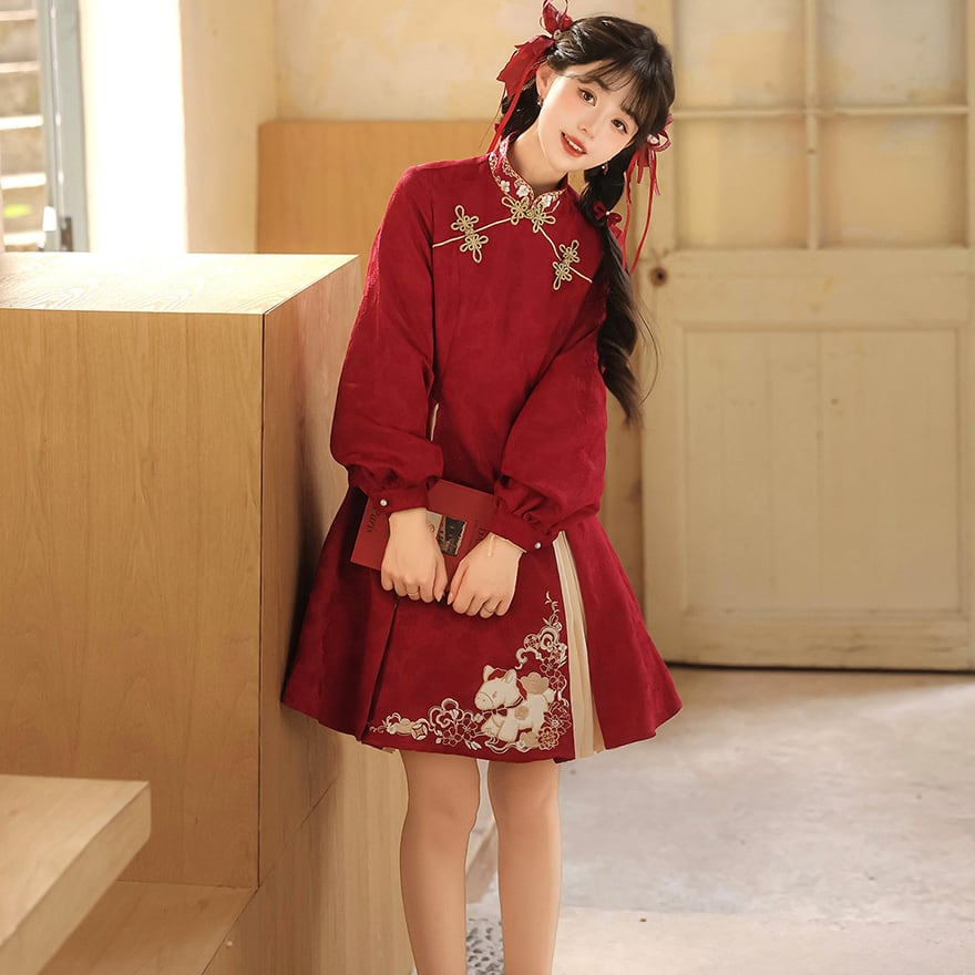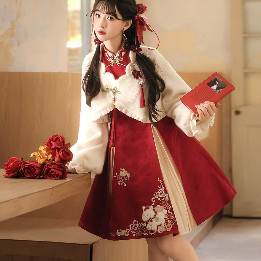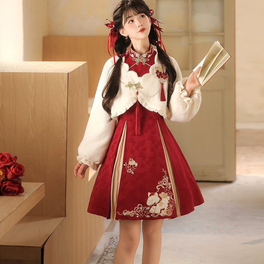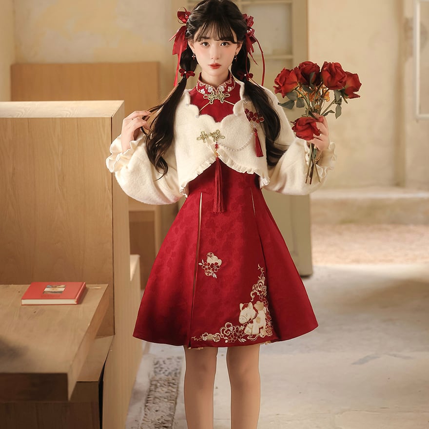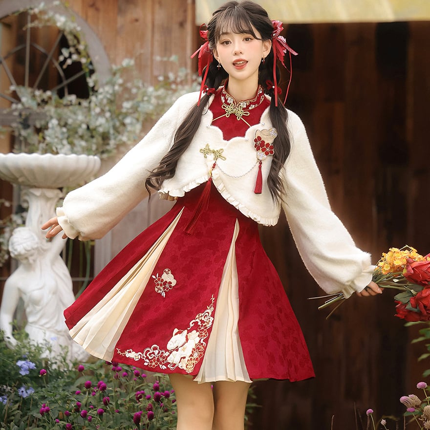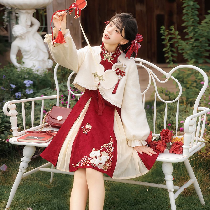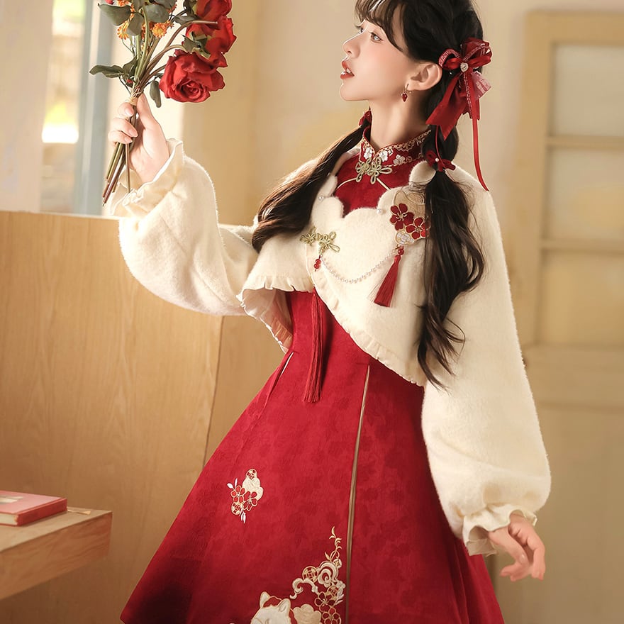 深みのあるレッドの生地に、スタンドカラーやチャイナボタンといった伝統的なディテールをあしらったワンピースと、ふわふわの白いファーボレロのセットアップです。