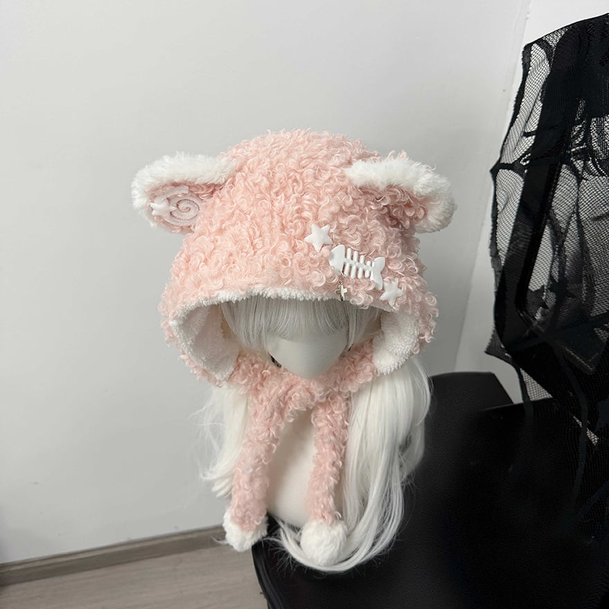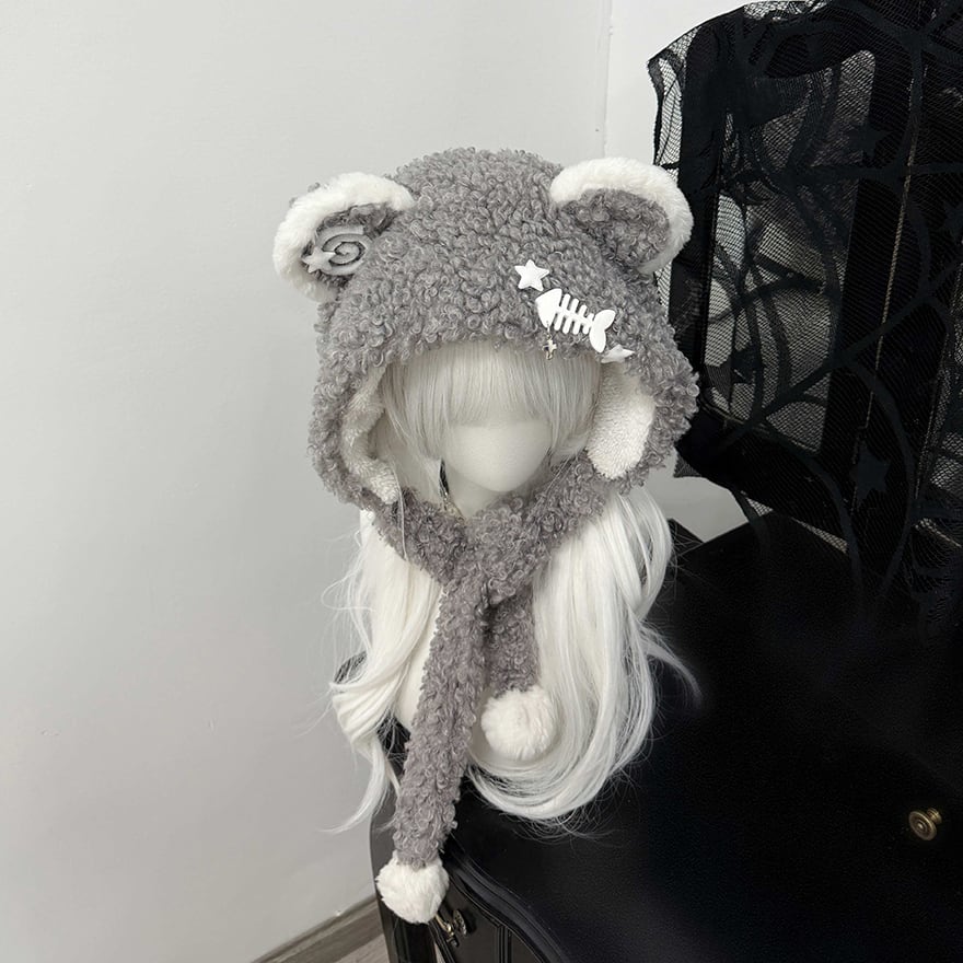 愛らしい丸い耳と、揺れるポンポン付きの紐がキュートな印象を与えつつ、サイドにあしらわれた「魚の骨」モチーフと星、十字架のチャームが、地雷系らしいシュールでダークな遊び心をプラスしています。