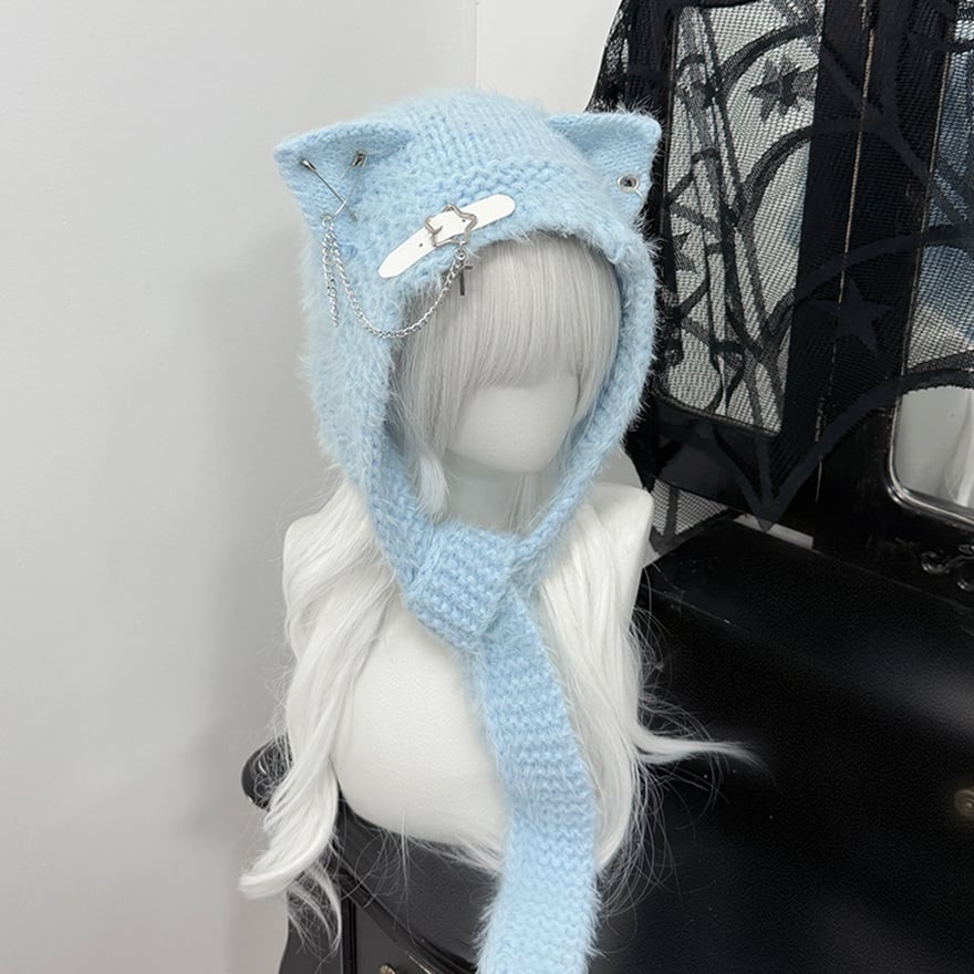 愛らしいネコ耳シルエットに対し、安全ピン、チェーン、十字架チャームといったハードな金属パーツをあしらうことで、地雷系やパンクファッションにぴったりの「病みかわ」なデザインに仕上げました。