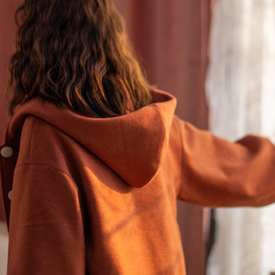 温かみのあるテラコッタオレンジの生地に、クリーム色のポケットフラップが可愛らしいアクセントになった、フード付きのジャケットです。