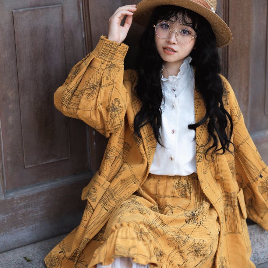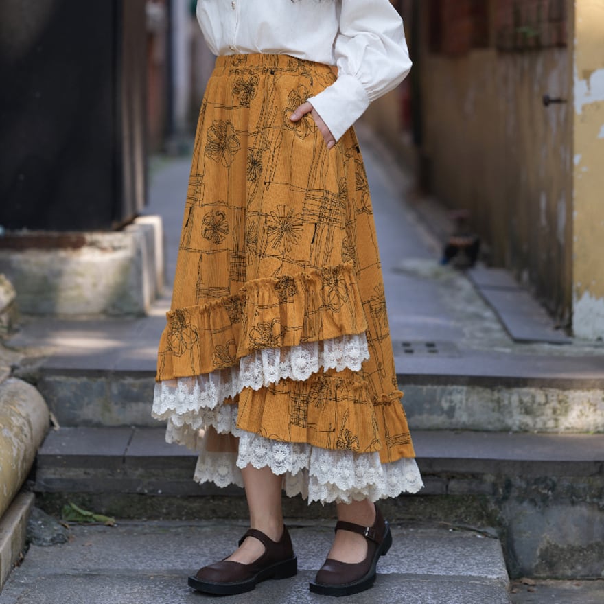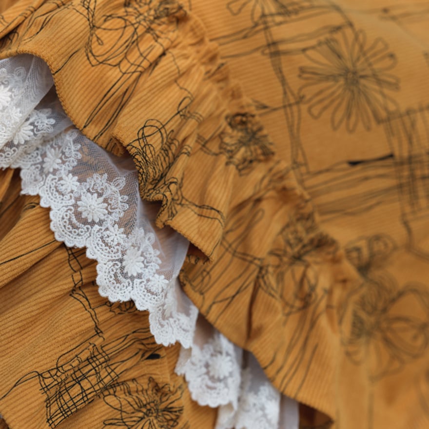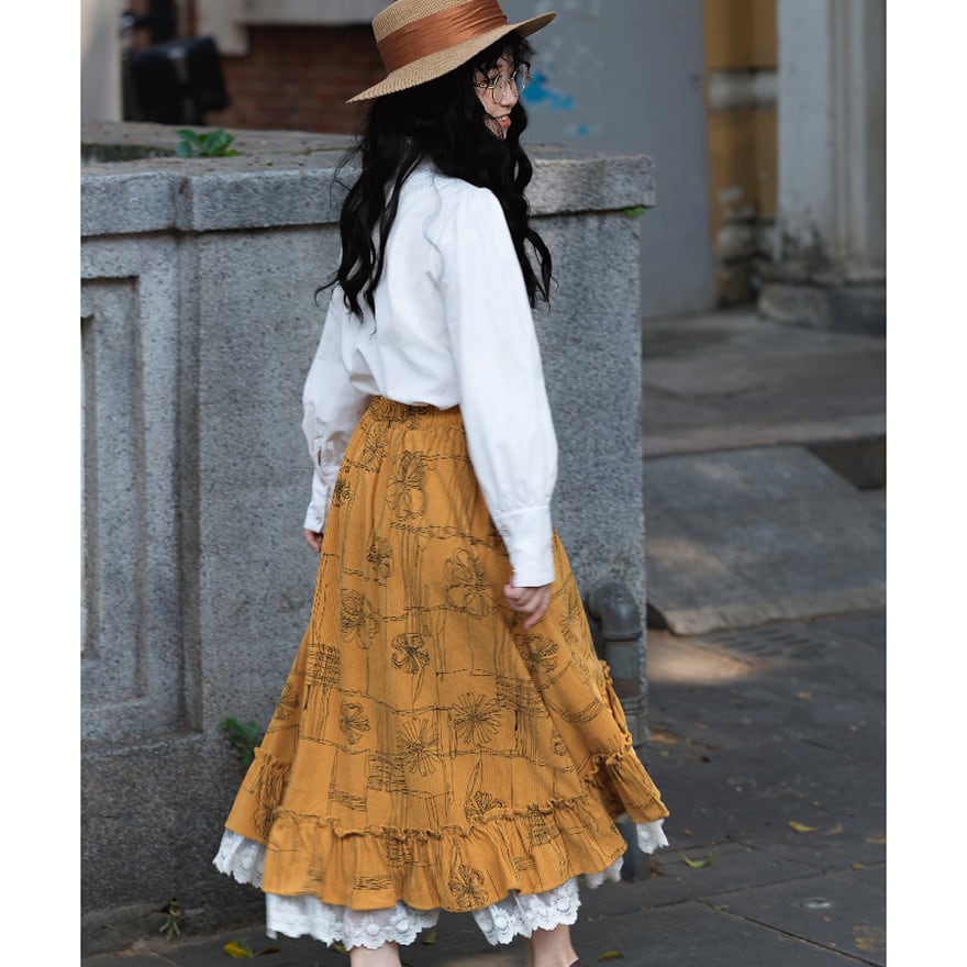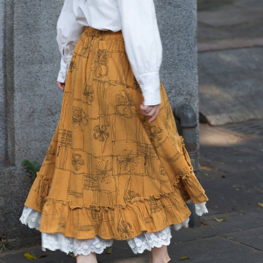 こっくりとしたマスタード色のコーデュロイ生地に、繊細な線画のフラワー柄をあしらった、レトロで温かみのあるスカートです。