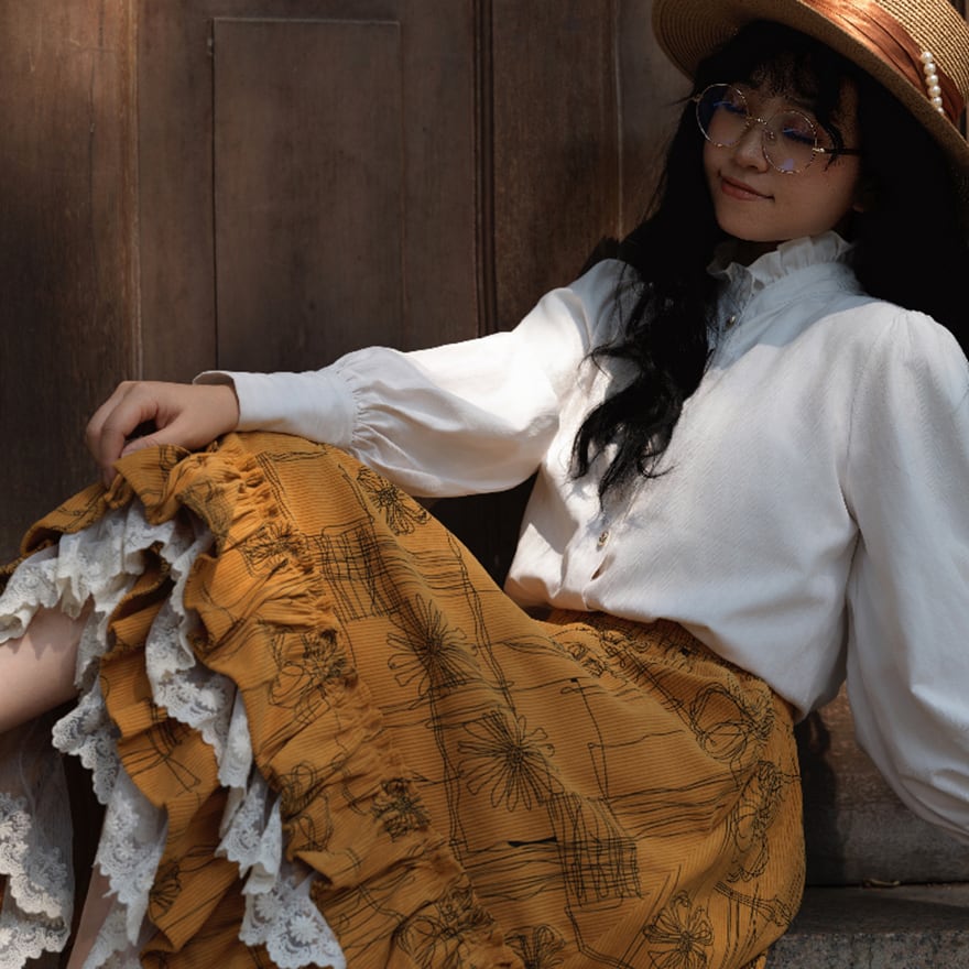 関連キーワード: #セミロリ #森ガール #コーデュロイ #スカート #レイヤード #レトロ #花柄 #レース #フリル #秋冬コーデ #マスタード